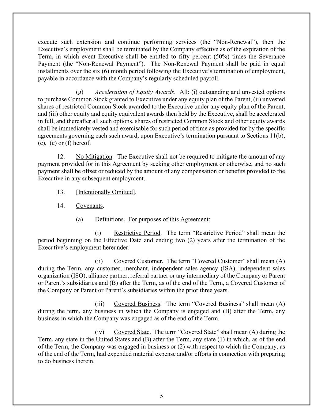 5 execute such extension and continue performing services (the “Non-Renewal”), then the Executive’s employment shall be terminated by the Company effective as of the expiration of the Term, in which event Executive shall be entitled to fifty percent (50%) times the Severance Payment (the “Non-Renewal Payment”). The Non-Renewal Payment shall be paid in equal installments over the six (6) month period following the Executive’s termination of employment, payable in accordance with the Company’s regularly scheduled payroll. (g) Acceleration of Equity Awards. All: (i) outstanding and unvested options to purchase Common Stock granted to Executive under any equity plan of the Parent, (ii) unvested shares of restricted Common Stock awarded to the Executive under any equity plan of the Parent, and (iii) other equity and equity equivalent awards then held by the Executive, shall be accelerated in full, and thereafter all such options, shares of restricted Common Stock and other equity awards shall be immediately vested and exercisable for such period of time as provided for by the specific agreements governing each such award, upon Executive’s termination pursuant to Sections 11(b), (c), (e) or (f) hereof. 12. No Mitigation. The Executive shall not be required to mitigate the amount of any payment provided for in this Agreement by seeking other employment or otherwise, and no such payment shall be offset or reduced by the amount of any compensation or benefits provided to the Executive in any subsequent employment. 13. [Intentionally Omitted]. 14. Covenants. (a) Definitions. For purposes of this Agreement: (i) Restrictive Period. The term “Restrictive Period” shall mean the period beginning on the Effective Date and ending two (2) years after the termination of the Executive’s employment hereunder. (ii) Covered Customer. The term “Covered Customer” shall mean (A) during the Term, any customer, merchant, independent sales agency (ISA), independent sales organization (ISO), alliance partner, referral partner or any intermediary of the Company or Parent or Parent’s subsidiaries and (B) after the Term, as of the end of the Term, a Covered Customer of the Company or Parent or Parent’s subsidiaries within the prior three years. (iii) Covered Business. The term “Covered Business” shall mean (A) during the term, any business in which the Company is engaged and (B) after the Term, any business in which the Company was engaged as of the end of the Term. (iv) Covered State. The term “Covered State” shall mean (A) during the Term, any state in the United States and (B) after the Term, any state (1) in which, as of the end of the Term, the Company was engaged in business or (2) with respect to which the Company, as of the end of the Term, had expended material expense and/or efforts in connection with preparing to do business therein.