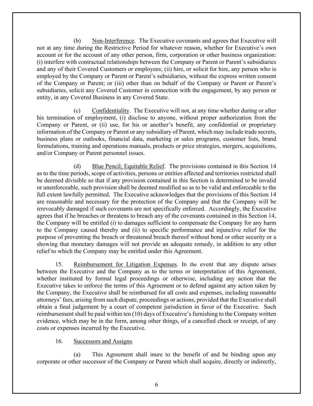 6 (b) Non-Interference. The Executive covenants and agrees that Executive will not at any time during the Restrictive Period for whatever reason, whether for Executive’s own account or for the account of any other person, firm, corporation or other business organization: (i) interfere with contractual relationships between the Company or Parent or Parent’s subsidiaries and any of their Covered Customers or employees; (ii) hire, or solicit for hire, any person who is employed by the Company or Parent or Parent’s subsidiaries, without the express written consent of the Company or Parent; or (iii) other than on behalf of the Company or Parent or Parent’s subsidiaries, solicit any Covered Customer in connection with the engagement, by any person or entity, in any Covered Business in any Covered State. (c) Confidentiality. The Executive will not, at any time whether during or after his termination of employment, (i) disclose to anyone, without proper authorization from the Company or Parent, or (ii) use, for his or another’s benefit, any confidential or proprietary information of the Company or Parent or any subsidiary of Parent, which may include trade secrets, business plans or outlooks, financial data, marketing or sales programs, customer lists, brand formulations, training and operations manuals, products or price strategies, mergers, acquisitions, and/or Company or Parent personnel issues. (d) Blue Pencil; Equitable Relief. The provisions contained in this Section 14 as to the time periods, scope of activities, persons or entities affected and territories restricted shall be deemed divisible so that if any provision contained in this Section is determined to be invalid or unenforceable, such provision shall be deemed modified so as to be valid and enforceable to the full extent lawfully permitted. The Executive acknowledges that the provisions of this Section 14 are reasonable and necessary for the protection of the Company and that the Company will be irrevocably damaged if such covenants are not specifically enforced. Accordingly, the Executive agrees that if he breaches or threatens to breach any of the covenants contained in this Section 14, the Company will be entitled (i) to damages sufficient to compensate the Company for any harm to the Company caused thereby and (ii) to specific performance and injunctive relief for the purpose of preventing the breach or threatened breach thereof without bond or other security or a showing that monetary damages will not provide an adequate remedy, in addition to any other relief to which the Company may be entitled under this Agreement. 15. Reimbursement for Litigation Expenses. In the event that any dispute arises between the Executive and the Company as to the terms or interpretation of this Agreement, whether instituted by formal legal proceedings or otherwise, including any action that the Executive takes to enforce the terms of this Agreement or to defend against any action taken by the Company, the Executive shall be reimbursed for all costs and expenses, including reasonable attorneys’ fees, arising from such dispute, proceedings or actions, provided that the Executive shall obtain a final judgement by a court of competent jurisdiction in favor of the Executive. Such reimbursement shall be paid within ten (10) days of Executive’s furnishing to the Company written evidence, which may be in the form, among other things, of a cancelled check or receipt, of any costs or expenses incurred by the Executive. 16. Successors and Assigns. (a) This Agreement shall inure to the benefit of and be binding upon any corporate or other successor of the Company or Parent which shall acquire, directly or indirectly,