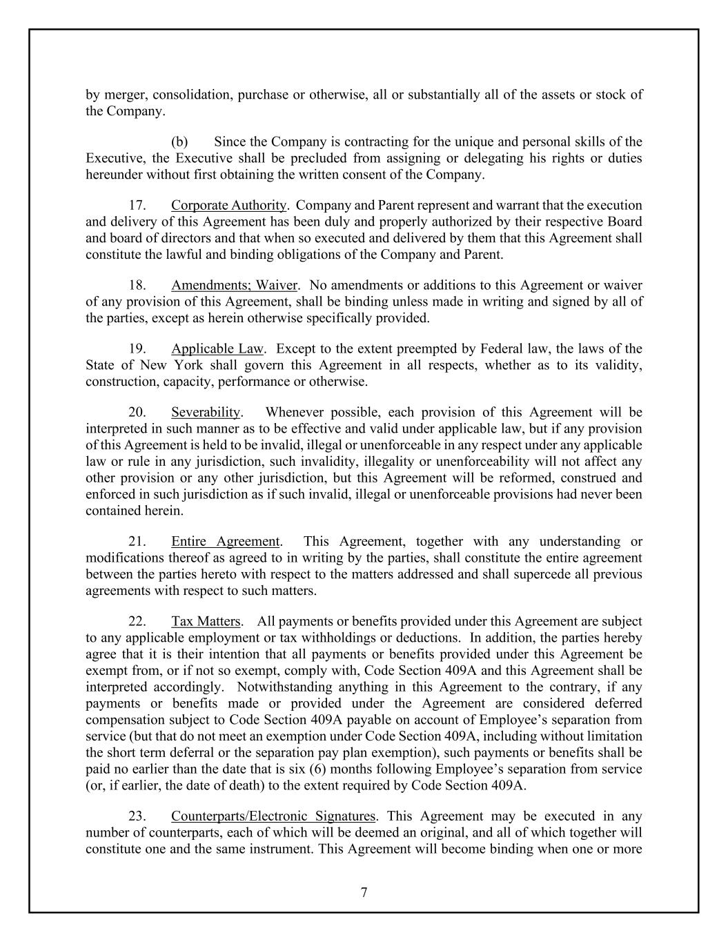 7 by merger, consolidation, purchase or otherwise, all or substantially all of the assets or stock of the Company. (b) Since the Company is contracting for the unique and personal skills of the Executive, the Executive shall be precluded from assigning or delegating his rights or duties hereunder without first obtaining the written consent of the Company. 17. Corporate Authority. Company and Parent represent and warrant that the execution and delivery of this Agreement has been duly and properly authorized by their respective Board and board of directors and that when so executed and delivered by them that this Agreement shall constitute the lawful and binding obligations of the Company and Parent. 18. Amendments; Waiver. No amendments or additions to this Agreement or waiver of any provision of this Agreement, shall be binding unless made in writing and signed by all of the parties, except as herein otherwise specifically provided. 19. Applicable Law. Except to the extent preempted by Federal law, the laws of the State of New York shall govern this Agreement in all respects, whether as to its validity, construction, capacity, performance or otherwise. 20. Severability. Whenever possible, each provision of this Agreement will be interpreted in such manner as to be effective and valid under applicable law, but if any provision of this Agreement is held to be invalid, illegal or unenforceable in any respect under any applicable law or rule in any jurisdiction, such invalidity, illegality or unenforceability will not affect any other provision or any other jurisdiction, but this Agreement will be reformed, construed and enforced in such jurisdiction as if such invalid, illegal or unenforceable provisions had never been contained herein. 21. Entire Agreement. This Agreement, together with any understanding or modifications thereof as agreed to in writing by the parties, shall constitute the entire agreement between the parties hereto with respect to the matters addressed and shall supercede all previous agreements with respect to such matters. 22. Tax Matters. All payments or benefits provided under this Agreement are subject to any applicable employment or tax withholdings or deductions. In addition, the parties hereby agree that it is their intention that all payments or benefits provided under this Agreement be exempt from, or if not so exempt, comply with, Code Section 409A and this Agreement shall be interpreted accordingly. Notwithstanding anything in this Agreement to the contrary, if any payments or benefits made or provided under the Agreement are considered deferred compensation subject to Code Section 409A payable on account of Employee’s separation from service (but that do not meet an exemption under Code Section 409A, including without limitation the short term deferral or the separation pay plan exemption), such payments or benefits shall be paid no earlier than the date that is six (6) months following Employee’s separation from service (or, if earlier, the date of death) to the extent required by Code Section 409A. 23. Counterparts/Electronic Signatures. This Agreement may be executed in any number of counterparts, each of which will be deemed an original, and all of which together will constitute one and the same instrument. This Agreement will become binding when one or more