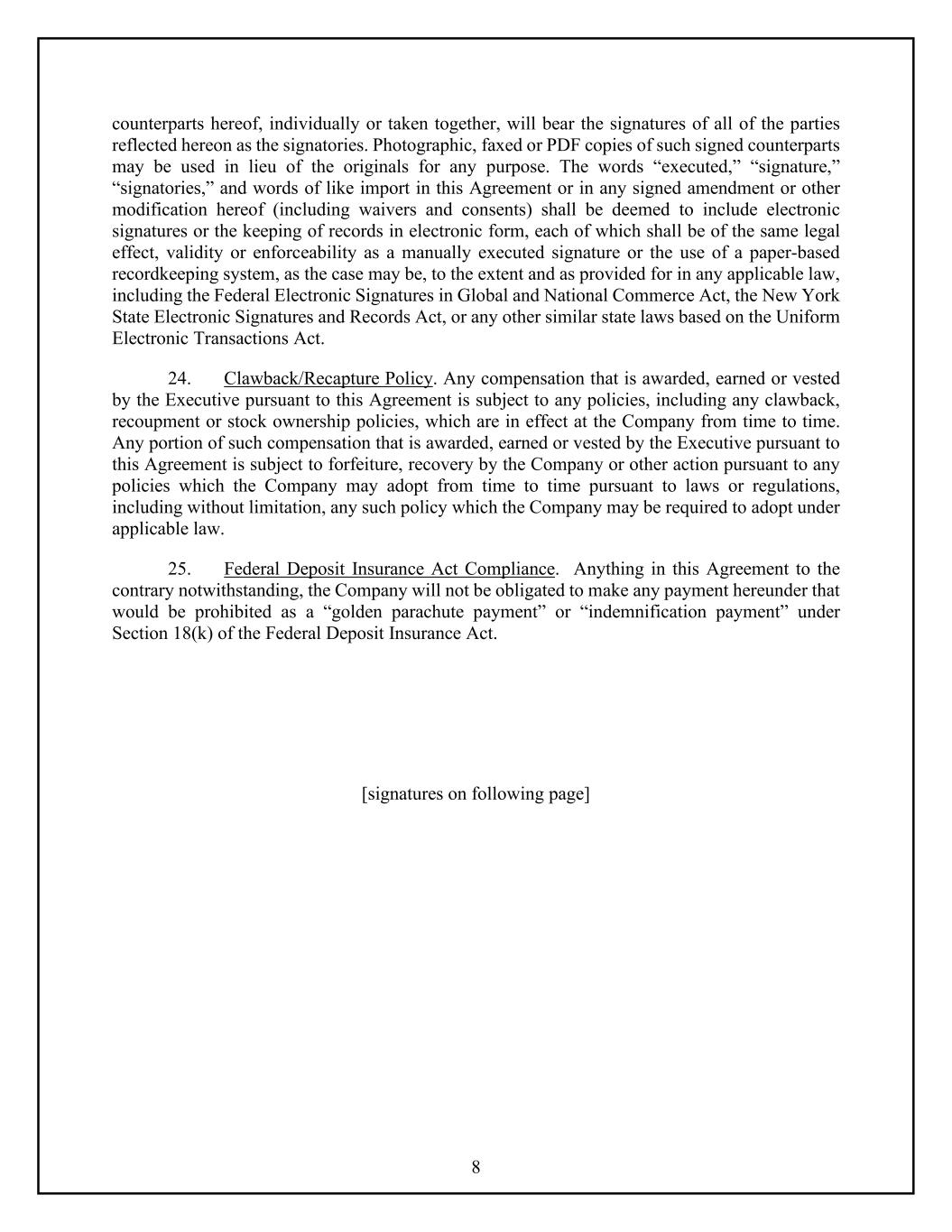 8 counterparts hereof, individually or taken together, will bear the signatures of all of the parties reflected hereon as the signatories. Photographic, faxed or PDF copies of such signed counterparts may be used in lieu of the originals for any purpose. The words “executed,” “signature,” “signatories,” and words of like import in this Agreement or in any signed amendment or other modification hereof (including waivers and consents) shall be deemed to include electronic signatures or the keeping of records in electronic form, each of which shall be of the same legal effect, validity or enforceability as a manually executed signature or the use of a paper-based recordkeeping system, as the case may be, to the extent and as provided for in any applicable law, including the Federal Electronic Signatures in Global and National Commerce Act, the New York State Electronic Signatures and Records Act, or any other similar state laws based on the Uniform Electronic Transactions Act. 24. Clawback/Recapture Policy. Any compensation that is awarded, earned or vested by the Executive pursuant to this Agreement is subject to any policies, including any clawback, recoupment or stock ownership policies, which are in effect at the Company from time to time. Any portion of such compensation that is awarded, earned or vested by the Executive pursuant to this Agreement is subject to forfeiture, recovery by the Company or other action pursuant to any policies which the Company may adopt from time to time pursuant to laws or regulations, including without limitation, any such policy which the Company may be required to adopt under applicable law. 25. Federal Deposit Insurance Act Compliance. Anything in this Agreement to the contrary notwithstanding, the Company will not be obligated to make any payment hereunder that would be prohibited as a “golden parachute payment” or “indemnification payment” under Section 18(k) of the Federal Deposit Insurance Act. [signatures on following page]