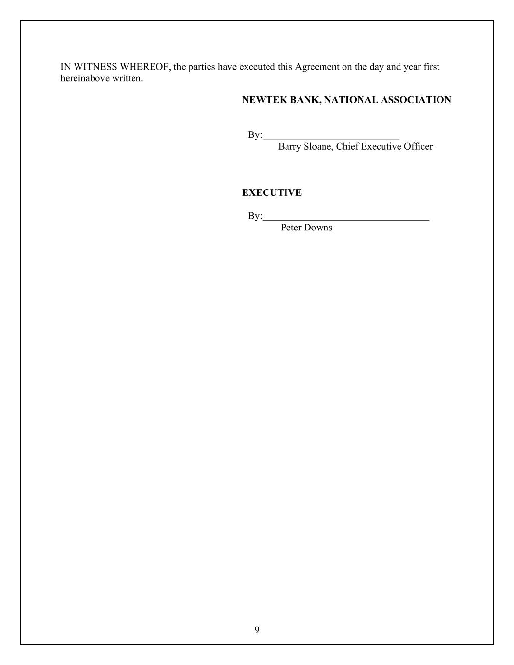 9 IN WITNESS WHEREOF, the parties have executed this Agreement on the day and year first hereinabove written. NEWTEK BANK, NATIONAL ASSOCIATION By: Barry Sloane, Chief Executive Officer EXECUTIVE By: Peter Downs