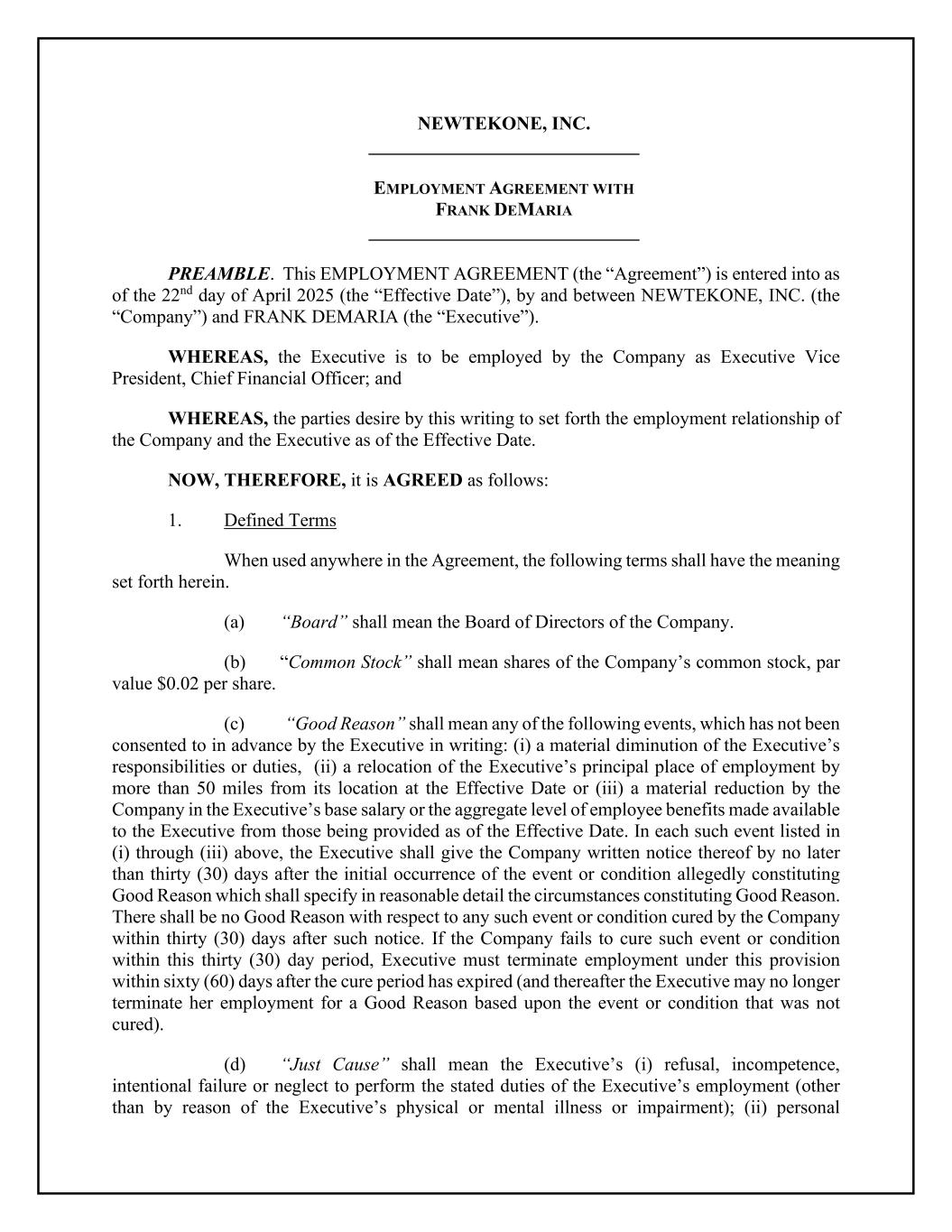 NEWTEKONE, INC. _____________________________ EMPLOYMENT AGREEMENT WITH FRANK DEMARIA _____________________________ PREAMBLE. This EMPLOYMENT AGREEMENT (the “Agreement”) is entered into as of the 22nd day of April 2025 (the “Effective Date”), by and between NEWTEKONE, INC. (the “Company”) and FRANK DEMARIA (the “Executive”). WHEREAS, the Executive is to be employed by the Company as Executive Vice President, Chief Financial Officer; and WHEREAS, the parties desire by this writing to set forth the employment relationship of the Company and the Executive as of the Effective Date. NOW, THEREFORE, it is AGREED as follows: 1. Defined Terms When used anywhere in the Agreement, the following terms shall have the meaning set forth herein. (a) “Board” shall mean the Board of Directors of the Company. (b) “Common Stock” shall mean shares of the Company’s common stock, par value $0.02 per share. (c) “Good Reason” shall mean any of the following events, which has not been consented to in advance by the Executive in writing: (i) a material diminution of the Executive’s responsibilities or duties, (ii) a relocation of the Executive’s principal place of employment by more than 50 miles from its location at the Effective Date or (iii) a material reduction by the Company in the Executive’s base salary or the aggregate level of employee benefits made available to the Executive from those being provided as of the Effective Date. In each such event listed in (i) through (iii) above, the Executive shall give the Company written notice thereof by no later than thirty (30) days after the initial occurrence of the event or condition allegedly constituting Good Reason which shall specify in reasonable detail the circumstances constituting Good Reason. There shall be no Good Reason with respect to any such event or condition cured by the Company within thirty (30) days after such notice. If the Company fails to cure such event or condition within this thirty (30) day period, Executive must terminate employment under this provision within sixty (60) days after the cure period has expired (and thereafter the Executive may no longer terminate her employment for a Good Reason based upon the event or condition that was not cured). (d) “Just Cause” shall mean the Executive’s (i) refusal, incompetence, intentional failure or neglect to perform the stated duties of the Executive’s employment (other than by reason of the Executive’s physical or mental illness or impairment); (ii) personal