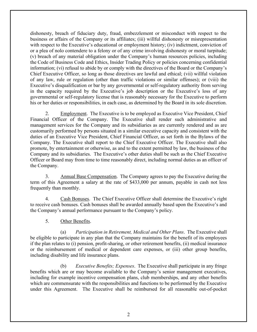2 dishonesty, breach of fiduciary duty, fraud, embezzlement or misconduct with respect to the business or affairs of the Company or its affiliates; (iii) willful dishonesty or misrepresentation with respect to the Executive’s educational or employment history; (iv) indictment, conviction of or a plea of nolo contendere to a felony or of any crime involving dishonesty or moral turpitude; (v) breach of any material obligation under the Company’s human resources policies, including the Code of Business Code and Ethics, Insider Trading Policy or policies concerning confidential information; (vi) refusal to abide by or comply with the directives of the Board or the Company’s Chief Executive Officer, so long as those directives are lawful and ethical; (vii) willful violation of any law, rule or regulation (other than traffic violations or similar offenses); or (viii) the Executive’s disqualification or bar by any governmental or self-regulatory authority from serving in the capacity required by the Executive’s job description or the Executive’s loss of any governmental or self-regulatory license that is reasonably necessary for the Executive to perform his or her duties or responsibilities, in each case, as determined by the Board in its sole discretion. 2. Employment. The Executive is to be employed as Executive Vice President, Chief Financial Officer of the Company. The Executive shall render such administrative and management services for the Company and its subsidiaries as are currently rendered and as are customarily performed by persons situated in a similar executive capacity and consistent with the duties of an Executive Vice President, Chief Financial Officer, as set forth in the Bylaws of the Company. The Executive shall report to the Chief Executive Officer. The Executive shall also promote, by entertainment or otherwise, as and to the extent permitted by law, the business of the Company and its subsidiaries. The Executive’s other duties shall be such as the Chief Executive Officer or Board may from time to time reasonably direct, including normal duties as an officer of the Company. 3. Annual Base Compensation. The Company agrees to pay the Executive during the term of this Agreement a salary at the rate of $433,000 per annum, payable in cash not less frequently than monthly. 4. Cash Bonuses. The Chief Executive Officer shall determine the Executive’s right to receive cash bonuses. Cash bonuses shall be awarded annually based upon the Executive’s and the Company’s annual performance pursuant to the Company’s policy. 5. Other Benefits. (a) Participation in Retirement, Medical and Other Plans. The Executive shall be eligible to participate in any plan that the Company maintains for the benefit of its employees if the plan relates to (i) pension, profit-sharing, or other retirement benefits, (ii) medical insurance or the reimbursement of medical or dependent care expenses, or (iii) other group benefits, including disability and life insurance plans. (b) Executive Benefits; Expenses. The Executive shall participate in any fringe benefits which are or may become available to the Company’s senior management executives, including for example incentive compensation plans, club memberships, and any other benefits which are commensurate with the responsibilities and functions to be performed by the Executive under this Agreement. The Executive shall be reimbursed for all reasonable out-of-pocket