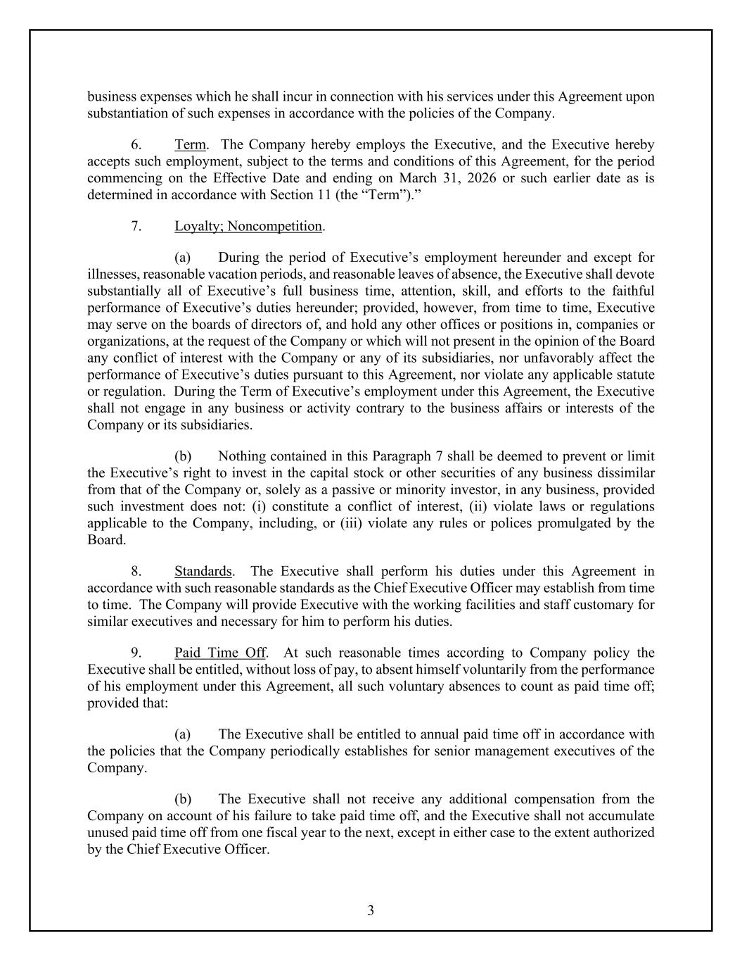 3 business expenses which he shall incur in connection with his services under this Agreement upon substantiation of such expenses in accordance with the policies of the Company. 6. Term. The Company hereby employs the Executive, and the Executive hereby accepts such employment, subject to the terms and conditions of this Agreement, for the period commencing on the Effective Date and ending on March 31, 2026 or such earlier date as is determined in accordance with Section 11 (the “Term”).” 7. Loyalty; Noncompetition. (a) During the period of Executive’s employment hereunder and except for illnesses, reasonable vacation periods, and reasonable leaves of absence, the Executive shall devote substantially all of Executive’s full business time, attention, skill, and efforts to the faithful performance of Executive’s duties hereunder; provided, however, from time to time, Executive may serve on the boards of directors of, and hold any other offices or positions in, companies or organizations, at the request of the Company or which will not present in the opinion of the Board any conflict of interest with the Company or any of its subsidiaries, nor unfavorably affect the performance of Executive’s duties pursuant to this Agreement, nor violate any applicable statute or regulation. During the Term of Executive’s employment under this Agreement, the Executive shall not engage in any business or activity contrary to the business affairs or interests of the Company or its subsidiaries. (b) Nothing contained in this Paragraph 7 shall be deemed to prevent or limit the Executive’s right to invest in the capital stock or other securities of any business dissimilar from that of the Company or, solely as a passive or minority investor, in any business, provided such investment does not: (i) constitute a conflict of interest, (ii) violate laws or regulations applicable to the Company, including, or (iii) violate any rules or polices promulgated by the Board. 8. Standards. The Executive shall perform his duties under this Agreement in accordance with such reasonable standards as the Chief Executive Officer may establish from time to time. The Company will provide Executive with the working facilities and staff customary for similar executives and necessary for him to perform his duties. 9. Paid Time Off. At such reasonable times according to Company policy the Executive shall be entitled, without loss of pay, to absent himself voluntarily from the performance of his employment under this Agreement, all such voluntary absences to count as paid time off; provided that: (a) The Executive shall be entitled to annual paid time off in accordance with the policies that the Company periodically establishes for senior management executives of the Company. (b) The Executive shall not receive any additional compensation from the Company on account of his failure to take paid time off, and the Executive shall not accumulate unused paid time off from one fiscal year to the next, except in either case to the extent authorized by the Chief Executive Officer.