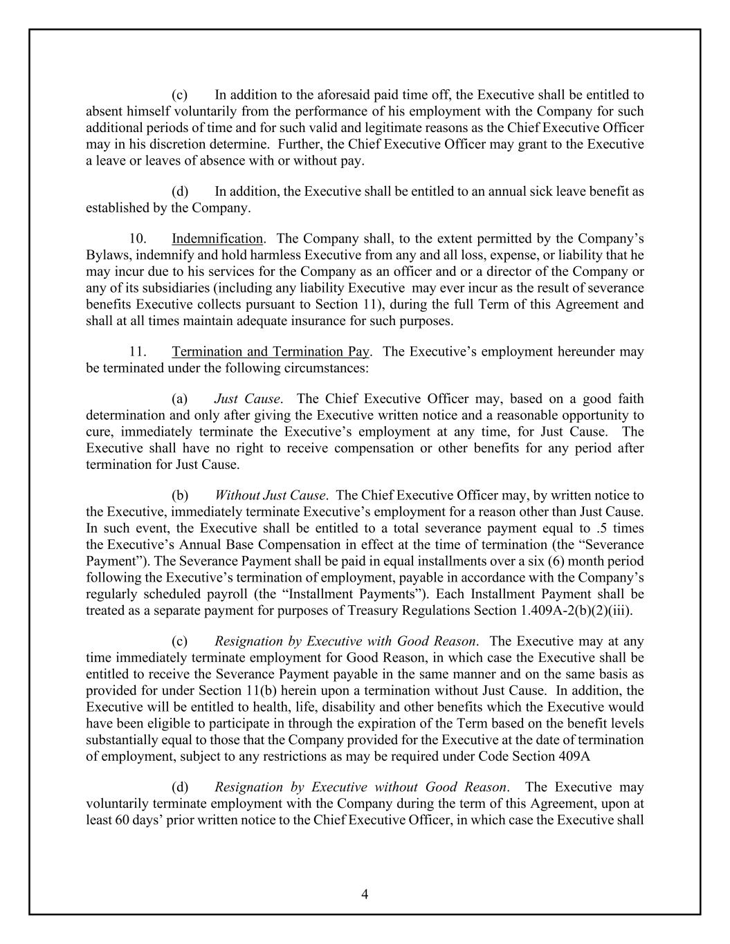 4 (c) In addition to the aforesaid paid time off, the Executive shall be entitled to absent himself voluntarily from the performance of his employment with the Company for such additional periods of time and for such valid and legitimate reasons as the Chief Executive Officer may in his discretion determine. Further, the Chief Executive Officer may grant to the Executive a leave or leaves of absence with or without pay. (d) In addition, the Executive shall be entitled to an annual sick leave benefit as established by the Company. 10. Indemnification. The Company shall, to the extent permitted by the Company’s Bylaws, indemnify and hold harmless Executive from any and all loss, expense, or liability that he may incur due to his services for the Company as an officer and or a director of the Company or any of its subsidiaries (including any liability Executive may ever incur as the result of severance benefits Executive collects pursuant to Section 11), during the full Term of this Agreement and shall at all times maintain adequate insurance for such purposes. 11. Termination and Termination Pay. The Executive’s employment hereunder may be terminated under the following circumstances: (a) Just Cause. The Chief Executive Officer may, based on a good faith determination and only after giving the Executive written notice and a reasonable opportunity to cure, immediately terminate the Executive’s employment at any time, for Just Cause. The Executive shall have no right to receive compensation or other benefits for any period after termination for Just Cause. (b) Without Just Cause. The Chief Executive Officer may, by written notice to the Executive, immediately terminate Executive’s employment for a reason other than Just Cause. In such event, the Executive shall be entitled to a total severance payment equal to .5 times the Executive’s Annual Base Compensation in effect at the time of termination (the “Severance Payment”). The Severance Payment shall be paid in equal installments over a six (6) month period following the Executive’s termination of employment, payable in accordance with the Company’s regularly scheduled payroll (the “Installment Payments”). Each Installment Payment shall be treated as a separate payment for purposes of Treasury Regulations Section 1.409A-2(b)(2)(iii). (c) Resignation by Executive with Good Reason. The Executive may at any time immediately terminate employment for Good Reason, in which case the Executive shall be entitled to receive the Severance Payment payable in the same manner and on the same basis as provided for under Section 11(b) herein upon a termination without Just Cause. In addition, the Executive will be entitled to health, life, disability and other benefits which the Executive would have been eligible to participate in through the expiration of the Term based on the benefit levels substantially equal to those that the Company provided for the Executive at the date of termination of employment, subject to any restrictions as may be required under Code Section 409A (d) Resignation by Executive without Good Reason. The Executive may voluntarily terminate employment with the Company during the term of this Agreement, upon at least 60 days’ prior written notice to the Chief Executive Officer, in which case the Executive shall