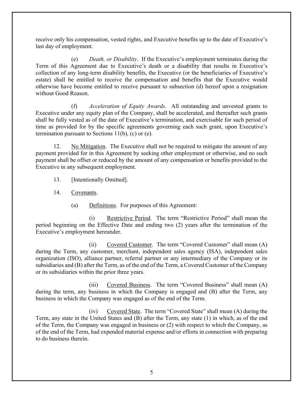 5 receive only his compensation, vested rights, and Executive benefits up to the date of Executive’s last day of employment. (e) Death, or Disability. If the Executive’s employment terminates during the Term of this Agreement due to Executive’s death or a disability that results in Executive’s collection of any long-term disability benefits, the Executive (or the beneficiaries of Executive’s estate) shall be entitled to receive the compensation and benefits that the Executive would otherwise have become entitled to receive pursuant to subsection (d) hereof upon a resignation without Good Reason. (f) Acceleration of Equity Awards. All outstanding and unvested grants to Executive under any equity plan of the Company, shall be accelerated, and thereafter such grants shall be fully vested as of the date of Executive’s termination, and exercisable for such period of time as provided for by the specific agreements governing each such grant, upon Executive’s termination pursuant to Sections 11(b), (c) or (e). 12. No Mitigation. The Executive shall not be required to mitigate the amount of any payment provided for in this Agreement by seeking other employment or otherwise, and no such payment shall be offset or reduced by the amount of any compensation or benefits provided to the Executive in any subsequent employment. 13. [Intentionally Omitted]. 14. Covenants. (a) Definitions. For purposes of this Agreement: (i) Restrictive Period. The term “Restrictive Period” shall mean the period beginning on the Effective Date and ending two (2) years after the termination of the Executive’s employment hereunder. (ii) Covered Customer. The term “Covered Customer” shall mean (A) during the Term, any customer, merchant, independent sales agency (ISA), independent sales organization (ISO), alliance partner, referral partner or any intermediary of the Company or its subsidiaries and (B) after the Term, as of the end of the Term, a Covered Customer of the Company or its subsidiaries within the prior three years. (iii) Covered Business. The term “Covered Business” shall mean (A) during the term, any business in which the Company is engaged and (B) after the Term, any business in which the Company was engaged as of the end of the Term. (iv) Covered State. The term “Covered State” shall mean (A) during the Term, any state in the United States and (B) after the Term, any state (1) in which, as of the end of the Term, the Company was engaged in business or (2) with respect to which the Company, as of the end of the Term, had expended material expense and/or efforts in connection with preparing to do business therein.