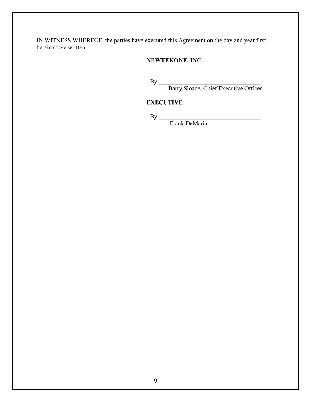 9 IN WITNESS WHEREOF, the parties have executed this Agreement on the day and year first hereinabove written. NEWTEKONE, INC. By: Barry Sloane, Chief Executive Officer EXECUTIVE By: Frank DeMaria