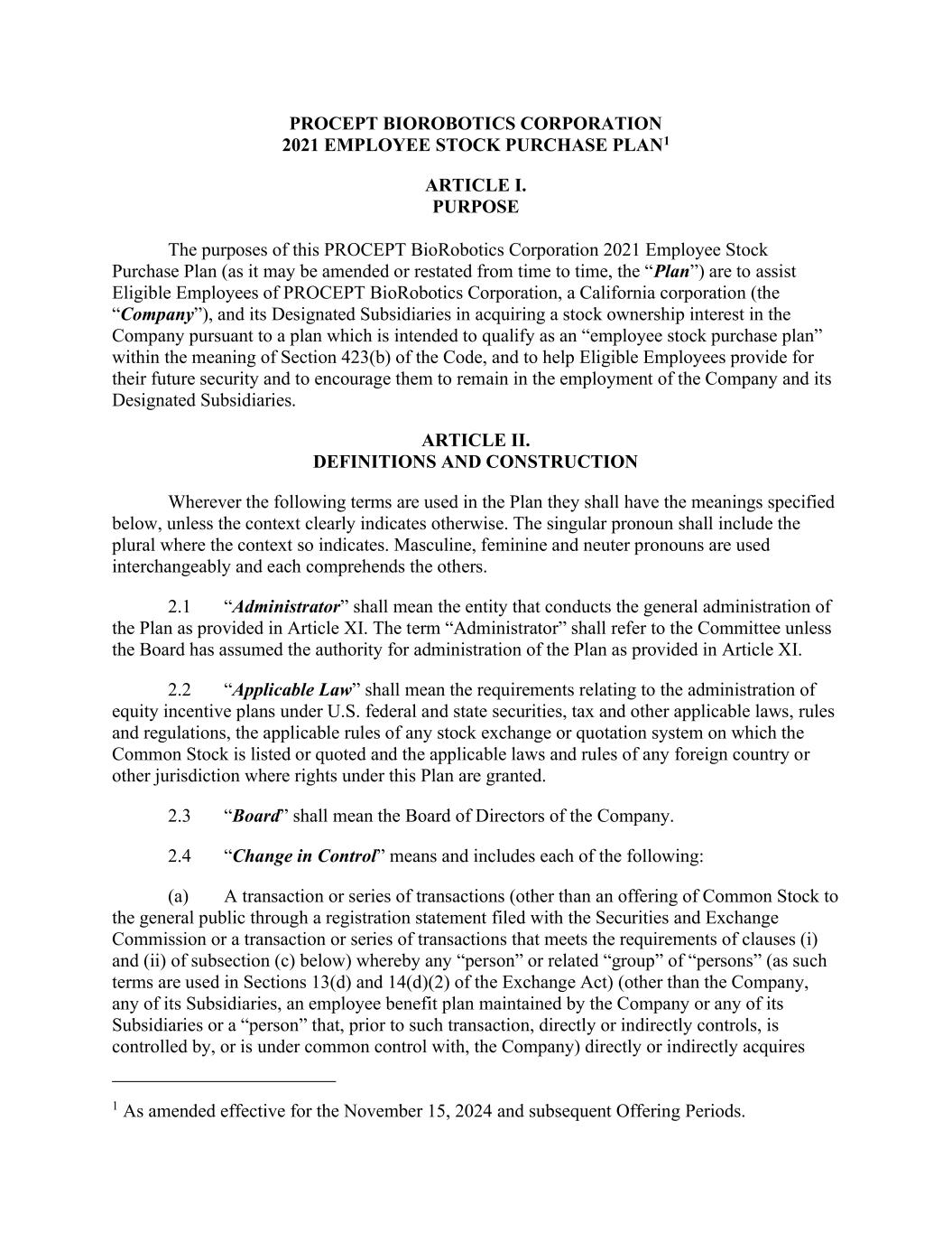 PROCEPT BIOROBOTICS CORPORATION 2021 EMPLOYEE STOCK PURCHASE PLAN1 ARTICLE I. PURPOSE The purposes of this PROCEPT BioRobotics Corporation 2021 Employee Stock Purchase Plan (as it may be amended or restated from time to time, the “Plan”) are to assist Eligible Employees of PROCEPT BioRobotics Corporation, a California corporation (the “Company”), and its Designated Subsidiaries in acquiring a stock ownership interest in the Company pursuant to a plan which is intended to qualify as an “employee stock purchase plan” within the meaning of Section 423(b) of the Code, and to help Eligible Employees provide for their future security and to encourage them to remain in the employment of the Company and its Designated Subsidiaries. ARTICLE II. DEFINITIONS AND CONSTRUCTION Wherever the following terms are used in the Plan they shall have the meanings specified below, unless the context clearly indicates otherwise. The singular pronoun shall include the plural where the context so indicates. Masculine, feminine and neuter pronouns are used interchangeably and each comprehends the others. 2.1 “Administrator” shall mean the entity that conducts the general administration of the Plan as provided in Article XI. The term “Administrator” shall refer to the Committee unless the Board has assumed the authority for administration of the Plan as provided in Article XI. 2.2 “Applicable Law” shall mean the requirements relating to the administration of equity incentive plans under U.S. federal and state securities, tax and other applicable laws, rules and regulations, the applicable rules of any stock exchange or quotation system on which the Common Stock is listed or quoted and the applicable laws and rules of any foreign country or other jurisdiction where rights under this Plan are granted. 2.3 “Board” shall mean the Board of Directors of the Company. 2.4 “Change in Control” means and includes each of the following: (a) A transaction or series of transactions (other than an offering of Common Stock to the general public through a registration statement filed with the Securities and Exchange Commission or a transaction or series of transactions that meets the requirements of clauses (i) and (ii) of subsection (c) below) whereby any “person” or related “group” of “persons” (as such terms are used in Sections 13(d) and 14(d)(2) of the Exchange Act) (other than the Company, any of its Subsidiaries, an employee benefit plan maintained by the Company or any of its Subsidiaries or a “person” that, prior to such transaction, directly or indirectly controls, is controlled by, or is under common control with, the Company) directly or indirectly acquires 1 As amended effective for the November 15, 2024 and subsequent Offering Periods.