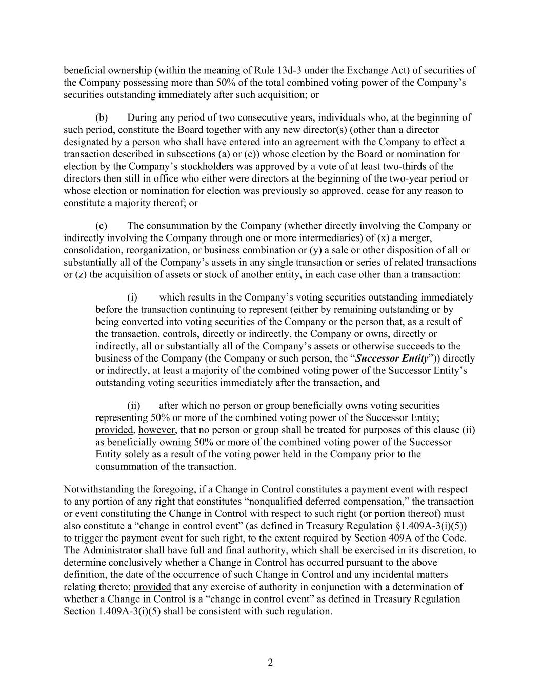 2 beneficial ownership (within the meaning of Rule 13d-3 under the Exchange Act) of securities of the Company possessing more than 50% of the total combined voting power of the Company’s securities outstanding immediately after such acquisition; or (b) During any period of two consecutive years, individuals who, at the beginning of such period, constitute the Board together with any new director(s) (other than a director designated by a person who shall have entered into an agreement with the Company to effect a transaction described in subsections (a) or (c)) whose election by the Board or nomination for election by the Company’s stockholders was approved by a vote of at least two-thirds of the directors then still in office who either were directors at the beginning of the two-year period or whose election or nomination for election was previously so approved, cease for any reason to constitute a majority thereof; or (c) The consummation by the Company (whether directly involving the Company or indirectly involving the Company through one or more intermediaries) of (x) a merger, consolidation, reorganization, or business combination or (y) a sale or other disposition of all or substantially all of the Company’s assets in any single transaction or series of related transactions or (z) the acquisition of assets or stock of another entity, in each case other than a transaction: (i) which results in the Company’s voting securities outstanding immediately before the transaction continuing to represent (either by remaining outstanding or by being converted into voting securities of the Company or the person that, as a result of the transaction, controls, directly or indirectly, the Company or owns, directly or indirectly, all or substantially all of the Company’s assets or otherwise succeeds to the business of the Company (the Company or such person, the “Successor Entity”)) directly or indirectly, at least a majority of the combined voting power of the Successor Entity’s outstanding voting securities immediately after the transaction, and (ii) after which no person or group beneficially owns voting securities representing 50% or more of the combined voting power of the Successor Entity; provided, however, that no person or group shall be treated for purposes of this clause (ii) as beneficially owning 50% or more of the combined voting power of the Successor Entity solely as a result of the voting power held in the Company prior to the consummation of the transaction. Notwithstanding the foregoing, if a Change in Control constitutes a payment event with respect to any portion of any right that constitutes “nonqualified deferred compensation,” the transaction or event constituting the Change in Control with respect to such right (or portion thereof) must also constitute a “change in control event” (as defined in Treasury Regulation §1.409A-3(i)(5)) to trigger the payment event for such right, to the extent required by Section 409A of the Code. The Administrator shall have full and final authority, which shall be exercised in its discretion, to determine conclusively whether a Change in Control has occurred pursuant to the above definition, the date of the occurrence of such Change in Control and any incidental matters relating thereto; provided that any exercise of authority in conjunction with a determination of whether a Change in Control is a “change in control event” as defined in Treasury Regulation Section 1.409A-3(i)(5) shall be consistent with such regulation.