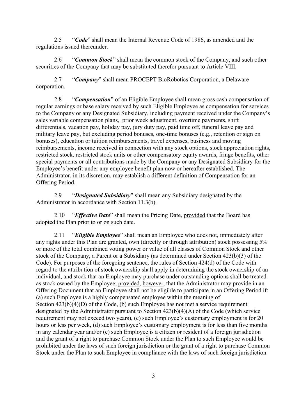 3 2.5 “Code” shall mean the Internal Revenue Code of 1986, as amended and the regulations issued thereunder. 2.6 “Common Stock” shall mean the common stock of the Company, and such other securities of the Company that may be substituted therefor pursuant to Article VIII. 2.7 “Company” shall mean PROCEPT BioRobotics Corporation, a Delaware corporation. 2.8 “Compensation” of an Eligible Employee shall mean gross cash compensation of regular earnings or base salary received by such Eligible Employee as compensation for services to the Company or any Designated Subsidiary, including payment received under the Company’s sales variable compensation plans, prior week adjustment, overtime payments, shift differentials, vacation pay, holiday pay, jury duty pay, paid time off, funeral leave pay and military leave pay, but excluding period bonuses, one-time bonuses (e.g., retention or sign on bonuses), education or tuition reimbursements, travel expenses, business and moving reimbursements, income received in connection with any stock options, stock appreciation rights, restricted stock, restricted stock units or other compensatory equity awards, fringe benefits, other special payments or all contributions made by the Company or any Designated Subsidiary for the Employee’s benefit under any employee benefit plan now or hereafter established. The Administrator, in its discretion, may establish a different definition of Compensation for an Offering Period. 2.9 “Designated Subsidiary” shall mean any Subsidiary designated by the Administrator in accordance with Section 11.3(b). 2.10 “Effective Date” shall mean the Pricing Date, provided that the Board has adopted the Plan prior to or on such date. 2.11 “Eligible Employee” shall mean an Employee who does not, immediately after any rights under this Plan are granted, own (directly or through attribution) stock possessing 5% or more of the total combined voting power or value of all classes of Common Stock and other stock of the Company, a Parent or a Subsidiary (as determined under Section 423(b)(3) of the Code). For purposes of the foregoing sentence, the rules of Section 424(d) of the Code with regard to the attribution of stock ownership shall apply in determining the stock ownership of an individual, and stock that an Employee may purchase under outstanding options shall be treated as stock owned by the Employee; provided, however, that the Administrator may provide in an Offering Document that an Employee shall not be eligible to participate in an Offering Period if: (a) such Employee is a highly compensated employee within the meaning of Section 423(b)(4)(D) of the Code, (b) such Employee has not met a service requirement designated by the Administrator pursuant to Section 423(b)(4)(A) of the Code (which service requirement may not exceed two years), (c) such Employee’s customary employment is for 20 hours or less per week, (d) such Employee’s customary employment is for less than five months in any calendar year and/or (e) such Employee is a citizen or resident of a foreign jurisdiction and the grant of a right to purchase Common Stock under the Plan to such Employee would be prohibited under the laws of such foreign jurisdiction or the grant of a right to purchase Common Stock under the Plan to such Employee in compliance with the laws of such foreign jurisdiction