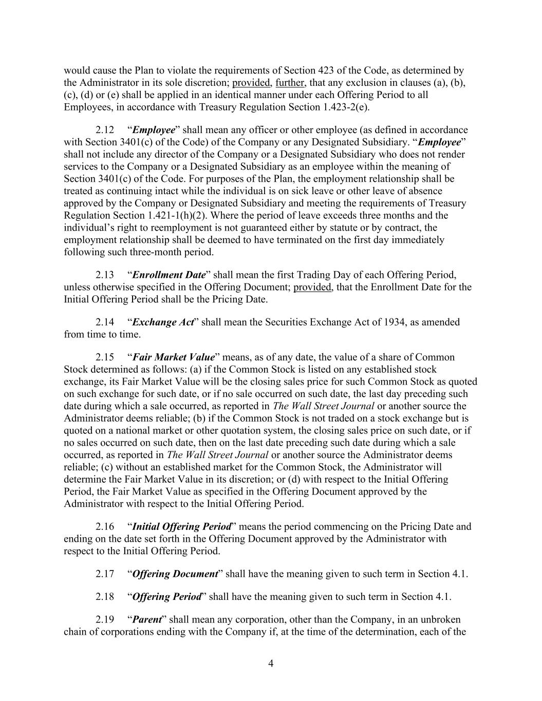 4 would cause the Plan to violate the requirements of Section 423 of the Code, as determined by the Administrator in its sole discretion; provided, further, that any exclusion in clauses (a), (b), (c), (d) or (e) shall be applied in an identical manner under each Offering Period to all Employees, in accordance with Treasury Regulation Section 1.423-2(e). 2.12 “Employee” shall mean any officer or other employee (as defined in accordance with Section 3401(c) of the Code) of the Company or any Designated Subsidiary. “Employee” shall not include any director of the Company or a Designated Subsidiary who does not render services to the Company or a Designated Subsidiary as an employee within the meaning of Section 3401(c) of the Code. For purposes of the Plan, the employment relationship shall be treated as continuing intact while the individual is on sick leave or other leave of absence approved by the Company or Designated Subsidiary and meeting the requirements of Treasury Regulation Section 1.421-1(h)(2). Where the period of leave exceeds three months and the individual’s right to reemployment is not guaranteed either by statute or by contract, the employment relationship shall be deemed to have terminated on the first day immediately following such three-month period. 2.13 “Enrollment Date” shall mean the first Trading Day of each Offering Period, unless otherwise specified in the Offering Document; provided, that the Enrollment Date for the Initial Offering Period shall be the Pricing Date. 2.14 “Exchange Act” shall mean the Securities Exchange Act of 1934, as amended from time to time. 2.15 “Fair Market Value” means, as of any date, the value of a share of Common Stock determined as follows: (a) if the Common Stock is listed on any established stock exchange, its Fair Market Value will be the closing sales price for such Common Stock as quoted on such exchange for such date, or if no sale occurred on such date, the last day preceding such date during which a sale occurred, as reported in The Wall Street Journal or another source the Administrator deems reliable; (b) if the Common Stock is not traded on a stock exchange but is quoted on a national market or other quotation system, the closing sales price on such date, or if no sales occurred on such date, then on the last date preceding such date during which a sale occurred, as reported in The Wall Street Journal or another source the Administrator deems reliable; (c) without an established market for the Common Stock, the Administrator will determine the Fair Market Value in its discretion; or (d) with respect to the Initial Offering Period, the Fair Market Value as specified in the Offering Document approved by the Administrator with respect to the Initial Offering Period. 2.16 “Initial Offering Period” means the period commencing on the Pricing Date and ending on the date set forth in the Offering Document approved by the Administrator with respect to the Initial Offering Period. 2.17 “Offering Document” shall have the meaning given to such term in Section 4.1. 2.18 “Offering Period” shall have the meaning given to such term in Section 4.1. 2.19 “Parent” shall mean any corporation, other than the Company, in an unbroken chain of corporations ending with the Company if, at the time of the determination, each of the