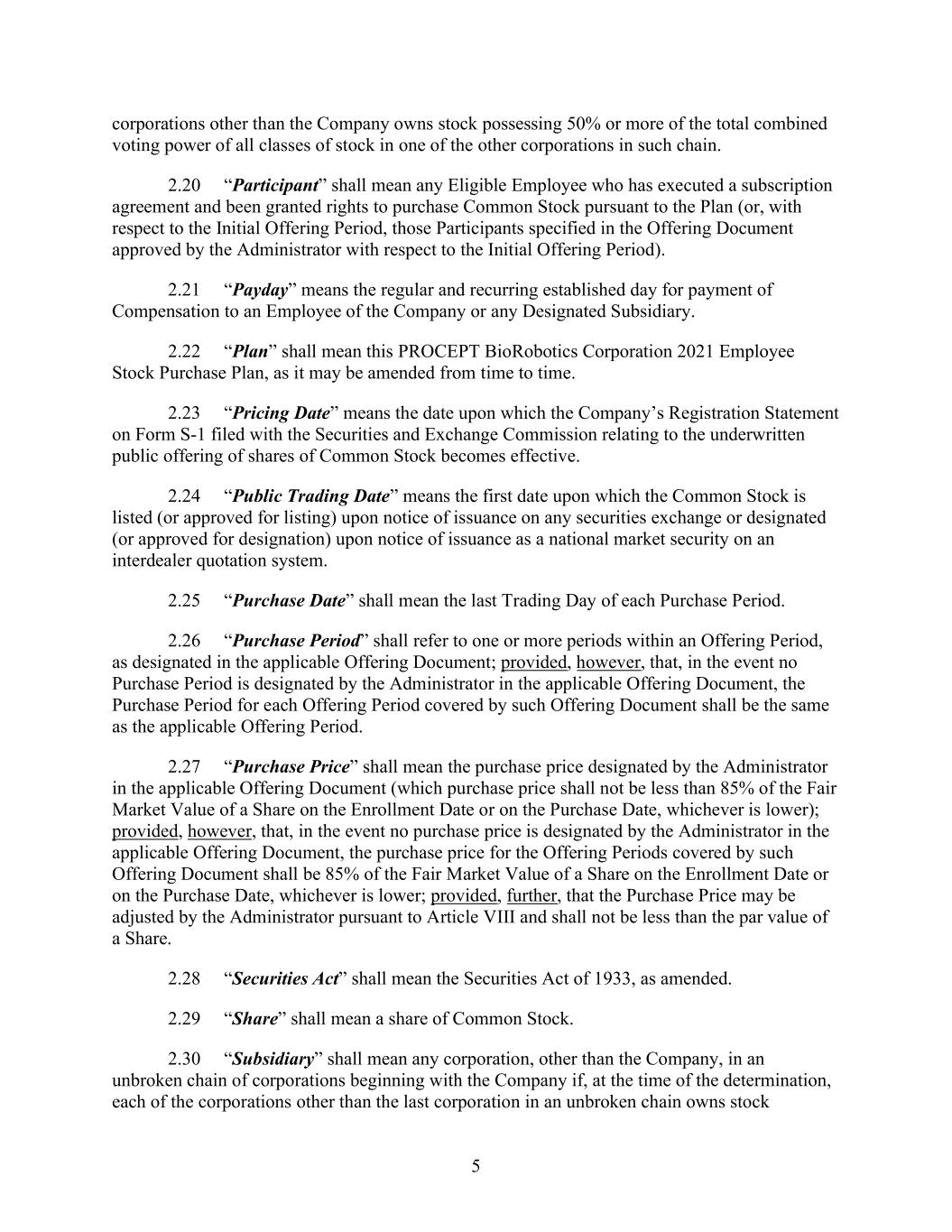 5 corporations other than the Company owns stock possessing 50% or more of the total combined voting power of all classes of stock in one of the other corporations in such chain. 2.20 “Participant” shall mean any Eligible Employee who has executed a subscription agreement and been granted rights to purchase Common Stock pursuant to the Plan (or, with respect to the Initial Offering Period, those Participants specified in the Offering Document approved by the Administrator with respect to the Initial Offering Period). 2.21 “Payday” means the regular and recurring established day for payment of Compensation to an Employee of the Company or any Designated Subsidiary. 2.22 “Plan” shall mean this PROCEPT BioRobotics Corporation 2021 Employee Stock Purchase Plan, as it may be amended from time to time. 2.23 “Pricing Date” means the date upon which the Company’s Registration Statement on Form S-1 filed with the Securities and Exchange Commission relating to the underwritten public offering of shares of Common Stock becomes effective. 2.24 “Public Trading Date” means the first date upon which the Common Stock is listed (or approved for listing) upon notice of issuance on any securities exchange or designated (or approved for designation) upon notice of issuance as a national market security on an interdealer quotation system. 2.25 “Purchase Date” shall mean the last Trading Day of each Purchase Period. 2.26 “Purchase Period” shall refer to one or more periods within an Offering Period, as designated in the applicable Offering Document; provided, however, that, in the event no Purchase Period is designated by the Administrator in the applicable Offering Document, the Purchase Period for each Offering Period covered by such Offering Document shall be the same as the applicable Offering Period. 2.27 “Purchase Price” shall mean the purchase price designated by the Administrator in the applicable Offering Document (which purchase price shall not be less than 85% of the Fair Market Value of a Share on the Enrollment Date or on the Purchase Date, whichever is lower); provided, however, that, in the event no purchase price is designated by the Administrator in the applicable Offering Document, the purchase price for the Offering Periods covered by such Offering Document shall be 85% of the Fair Market Value of a Share on the Enrollment Date or on the Purchase Date, whichever is lower; provided, further, that the Purchase Price may be adjusted by the Administrator pursuant to Article VIII and shall not be less than the par value of a Share. 2.28 “Securities Act” shall mean the Securities Act of 1933, as amended. 2.29 “Share” shall mean a share of Common Stock. 2.30 “Subsidiary” shall mean any corporation, other than the Company, in an unbroken chain of corporations beginning with the Company if, at the time of the determination, each of the corporations other than the last corporation in an unbroken chain owns stock