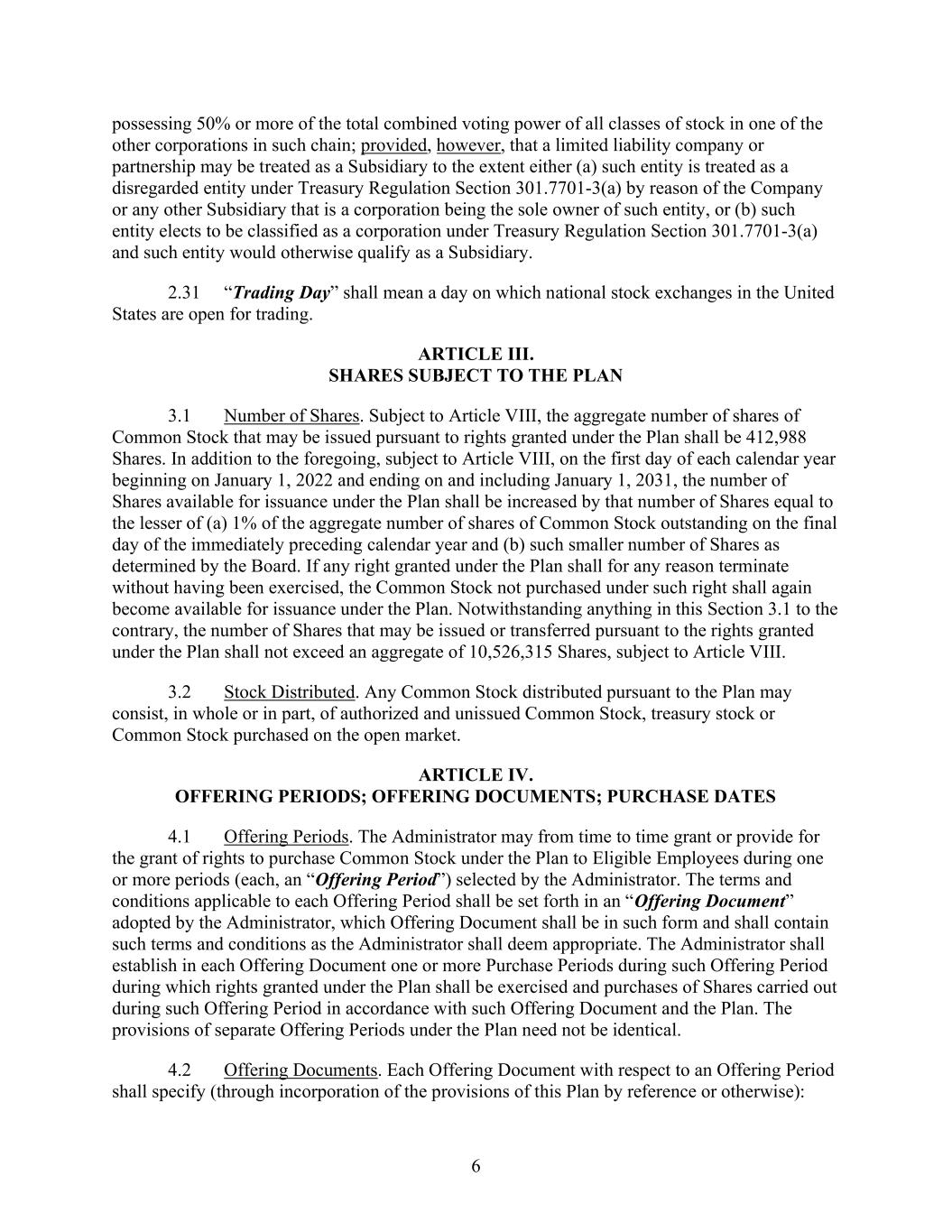 6 possessing 50% or more of the total combined voting power of all classes of stock in one of the other corporations in such chain; provided, however, that a limited liability company or partnership may be treated as a Subsidiary to the extent either (a) such entity is treated as a disregarded entity under Treasury Regulation Section 301.7701-3(a) by reason of the Company or any other Subsidiary that is a corporation being the sole owner of such entity, or (b) such entity elects to be classified as a corporation under Treasury Regulation Section 301.7701-3(a) and such entity would otherwise qualify as a Subsidiary. 2.31 “Trading Day” shall mean a day on which national stock exchanges in the United States are open for trading. ARTICLE III. SHARES SUBJECT TO THE PLAN 3.1 Number of Shares. Subject to Article VIII, the aggregate number of shares of Common Stock that may be issued pursuant to rights granted under the Plan shall be 412,988 Shares. In addition to the foregoing, subject to Article VIII, on the first day of each calendar year beginning on January 1, 2022 and ending on and including January 1, 2031, the number of Shares available for issuance under the Plan shall be increased by that number of Shares equal to the lesser of (a) 1% of the aggregate number of shares of Common Stock outstanding on the final day of the immediately preceding calendar year and (b) such smaller number of Shares as determined by the Board. If any right granted under the Plan shall for any reason terminate without having been exercised, the Common Stock not purchased under such right shall again become available for issuance under the Plan. Notwithstanding anything in this Section 3.1 to the contrary, the number of Shares that may be issued or transferred pursuant to the rights granted under the Plan shall not exceed an aggregate of 10,526,315 Shares, subject to Article VIII. 3.2 Stock Distributed. Any Common Stock distributed pursuant to the Plan may consist, in whole or in part, of authorized and unissued Common Stock, treasury stock or Common Stock purchased on the open market. ARTICLE IV. OFFERING PERIODS; OFFERING DOCUMENTS; PURCHASE DATES 4.1 Offering Periods. The Administrator may from time to time grant or provide for the grant of rights to purchase Common Stock under the Plan to Eligible Employees during one or more periods (each, an “Offering Period”) selected by the Administrator. The terms and conditions applicable to each Offering Period shall be set forth in an “Offering Document” adopted by the Administrator, which Offering Document shall be in such form and shall contain such terms and conditions as the Administrator shall deem appropriate. The Administrator shall establish in each Offering Document one or more Purchase Periods during such Offering Period during which rights granted under the Plan shall be exercised and purchases of Shares carried out during such Offering Period in accordance with such Offering Document and the Plan. The provisions of separate Offering Periods under the Plan need not be identical. 4.2 Offering Documents. Each Offering Document with respect to an Offering Period shall specify (through incorporation of the provisions of this Plan by reference or otherwise):