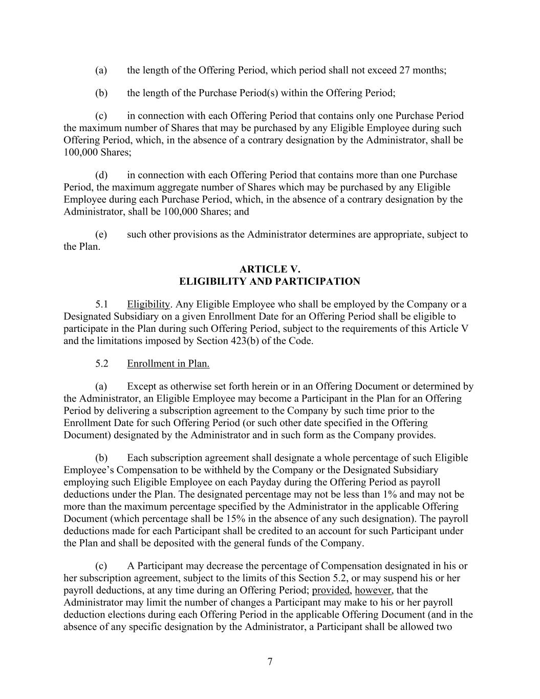 7 (a) the length of the Offering Period, which period shall not exceed 27 months; (b) the length of the Purchase Period(s) within the Offering Period; (c) in connection with each Offering Period that contains only one Purchase Period the maximum number of Shares that may be purchased by any Eligible Employee during such Offering Period, which, in the absence of a contrary designation by the Administrator, shall be 100,000 Shares; (d) in connection with each Offering Period that contains more than one Purchase Period, the maximum aggregate number of Shares which may be purchased by any Eligible Employee during each Purchase Period, which, in the absence of a contrary designation by the Administrator, shall be 100,000 Shares; and (e) such other provisions as the Administrator determines are appropriate, subject to the Plan. ARTICLE V. ELIGIBILITY AND PARTICIPATION 5.1 Eligibility. Any Eligible Employee who shall be employed by the Company or a Designated Subsidiary on a given Enrollment Date for an Offering Period shall be eligible to participate in the Plan during such Offering Period, subject to the requirements of this Article V and the limitations imposed by Section 423(b) of the Code. 5.2 Enrollment in Plan. (a) Except as otherwise set forth herein or in an Offering Document or determined by the Administrator, an Eligible Employee may become a Participant in the Plan for an Offering Period by delivering a subscription agreement to the Company by such time prior to the Enrollment Date for such Offering Period (or such other date specified in the Offering Document) designated by the Administrator and in such form as the Company provides. (b) Each subscription agreement shall designate a whole percentage of such Eligible Employee’s Compensation to be withheld by the Company or the Designated Subsidiary employing such Eligible Employee on each Payday during the Offering Period as payroll deductions under the Plan. The designated percentage may not be less than 1% and may not be more than the maximum percentage specified by the Administrator in the applicable Offering Document (which percentage shall be 15% in the absence of any such designation). The payroll deductions made for each Participant shall be credited to an account for such Participant under the Plan and shall be deposited with the general funds of the Company. (c) A Participant may decrease the percentage of Compensation designated in his or her subscription agreement, subject to the limits of this Section 5.2, or may suspend his or her payroll deductions, at any time during an Offering Period; provided, however, that the Administrator may limit the number of changes a Participant may make to his or her payroll deduction elections during each Offering Period in the applicable Offering Document (and in the absence of any specific designation by the Administrator, a Participant shall be allowed two