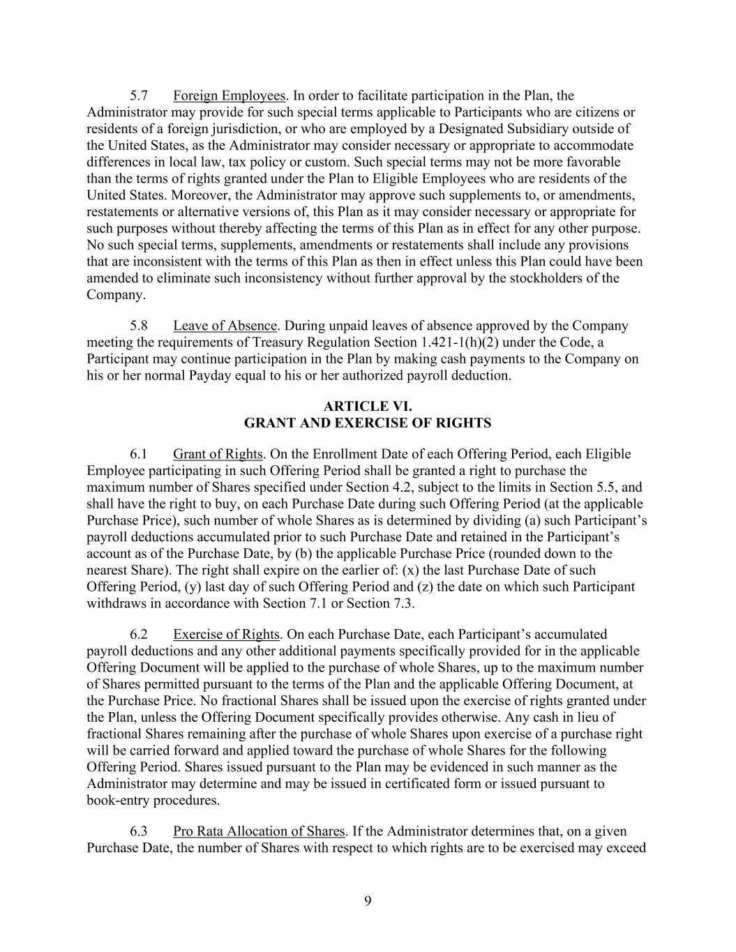 9 5.7 Foreign Employees. In order to facilitate participation in the Plan, the Administrator may provide for such special terms applicable to Participants who are citizens or residents of a foreign jurisdiction, or who are employed by a Designated Subsidiary outside of the United States, as the Administrator may consider necessary or appropriate to accommodate differences in local law, tax policy or custom. Such special terms may not be more favorable than the terms of rights granted under the Plan to Eligible Employees who are residents of the United States. Moreover, the Administrator may approve such supplements to, or amendments, restatements or alternative versions of, this Plan as it may consider necessary or appropriate for such purposes without thereby affecting the terms of this Plan as in effect for any other purpose. No such special terms, supplements, amendments or restatements shall include any provisions that are inconsistent with the terms of this Plan as then in effect unless this Plan could have been amended to eliminate such inconsistency without further approval by the stockholders of the Company. 5.8 Leave of Absence. During unpaid leaves of absence approved by the Company meeting the requirements of Treasury Regulation Section 1.421-1(h)(2) under the Code, a Participant may continue participation in the Plan by making cash payments to the Company on his or her normal Payday equal to his or her authorized payroll deduction. ARTICLE VI. GRANT AND EXERCISE OF RIGHTS 6.1 Grant of Rights. On the Enrollment Date of each Offering Period, each Eligible Employee participating in such Offering Period shall be granted a right to purchase the maximum number of Shares specified under Section 4.2, subject to the limits in Section 5.5, and shall have the right to buy, on each Purchase Date during such Offering Period (at the applicable Purchase Price), such number of whole Shares as is determined by dividing (a) such Participant’s payroll deductions accumulated prior to such Purchase Date and retained in the Participant’s account as of the Purchase Date, by (b) the applicable Purchase Price (rounded down to the nearest Share). The right shall expire on the earlier of: (x) the last Purchase Date of such Offering Period, (y) last day of such Offering Period and (z) the date on which such Participant withdraws in accordance with Section 7.1 or Section 7.3. 6.2 Exercise of Rights. On each Purchase Date, each Participant’s accumulated payroll deductions and any other additional payments specifically provided for in the applicable Offering Document will be applied to the purchase of whole Shares, up to the maximum number of Shares permitted pursuant to the terms of the Plan and the applicable Offering Document, at the Purchase Price. No fractional Shares shall be issued upon the exercise of rights granted under the Plan, unless the Offering Document specifically provides otherwise. Any cash in lieu of fractional Shares remaining after the purchase of whole Shares upon exercise of a purchase right will be carried forward and applied toward the purchase of whole Shares for the following Offering Period. Shares issued pursuant to the Plan may be evidenced in such manner as the Administrator may determine and may be issued in certificated form or issued pursuant to book-entry procedures. 6.3 Pro Rata Allocation of Shares. If the Administrator determines that, on a given Purchase Date, the number of Shares with respect to which rights are to be exercised may exceed
