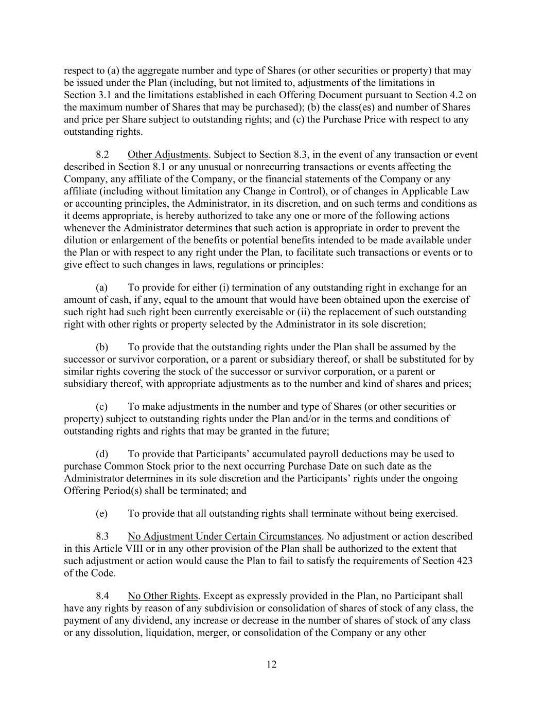 12 respect to (a) the aggregate number and type of Shares (or other securities or property) that may be issued under the Plan (including, but not limited to, adjustments of the limitations in Section 3.1 and the limitations established in each Offering Document pursuant to Section 4.2 on the maximum number of Shares that may be purchased); (b) the class(es) and number of Shares and price per Share subject to outstanding rights; and (c) the Purchase Price with respect to any outstanding rights. 8.2 Other Adjustments. Subject to Section 8.3, in the event of any transaction or event described in Section 8.1 or any unusual or nonrecurring transactions or events affecting the Company, any affiliate of the Company, or the financial statements of the Company or any affiliate (including without limitation any Change in Control), or of changes in Applicable Law or accounting principles, the Administrator, in its discretion, and on such terms and conditions as it deems appropriate, is hereby authorized to take any one or more of the following actions whenever the Administrator determines that such action is appropriate in order to prevent the dilution or enlargement of the benefits or potential benefits intended to be made available under the Plan or with respect to any right under the Plan, to facilitate such transactions or events or to give effect to such changes in laws, regulations or principles: (a) To provide for either (i) termination of any outstanding right in exchange for an amount of cash, if any, equal to the amount that would have been obtained upon the exercise of such right had such right been currently exercisable or (ii) the replacement of such outstanding right with other rights or property selected by the Administrator in its sole discretion; (b) To provide that the outstanding rights under the Plan shall be assumed by the successor or survivor corporation, or a parent or subsidiary thereof, or shall be substituted for by similar rights covering the stock of the successor or survivor corporation, or a parent or subsidiary thereof, with appropriate adjustments as to the number and kind of shares and prices; (c) To make adjustments in the number and type of Shares (or other securities or property) subject to outstanding rights under the Plan and/or in the terms and conditions of outstanding rights and rights that may be granted in the future; (d) To provide that Participants’ accumulated payroll deductions may be used to purchase Common Stock prior to the next occurring Purchase Date on such date as the Administrator determines in its sole discretion and the Participants’ rights under the ongoing Offering Period(s) shall be terminated; and (e) To provide that all outstanding rights shall terminate without being exercised. 8.3 No Adjustment Under Certain Circumstances. No adjustment or action described in this Article VIII or in any other provision of the Plan shall be authorized to the extent that such adjustment or action would cause the Plan to fail to satisfy the requirements of Section 423 of the Code. 8.4 No Other Rights. Except as expressly provided in the Plan, no Participant shall have any rights by reason of any subdivision or consolidation of shares of stock of any class, the payment of any dividend, any increase or decrease in the number of shares of stock of any class or any dissolution, liquidation, merger, or consolidation of the Company or any other