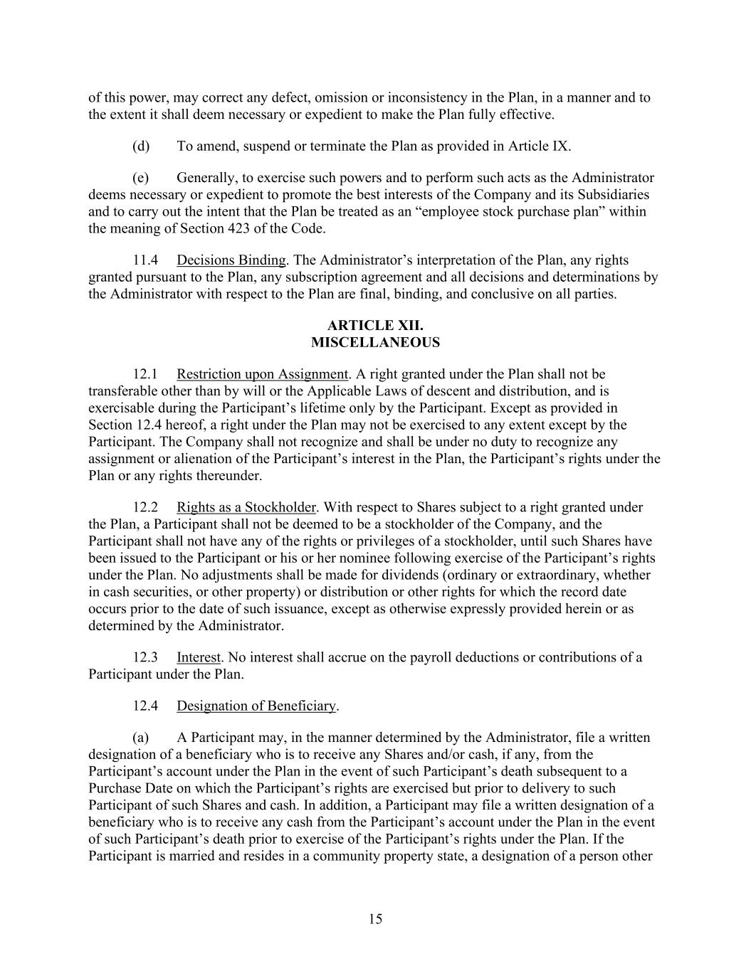 15 of this power, may correct any defect, omission or inconsistency in the Plan, in a manner and to the extent it shall deem necessary or expedient to make the Plan fully effective. (d) To amend, suspend or terminate the Plan as provided in Article IX. (e) Generally, to exercise such powers and to perform such acts as the Administrator deems necessary or expedient to promote the best interests of the Company and its Subsidiaries and to carry out the intent that the Plan be treated as an “employee stock purchase plan” within the meaning of Section 423 of the Code. 11.4 Decisions Binding. The Administrator’s interpretation of the Plan, any rights granted pursuant to the Plan, any subscription agreement and all decisions and determinations by the Administrator with respect to the Plan are final, binding, and conclusive on all parties. ARTICLE XII. MISCELLANEOUS 12.1 Restriction upon Assignment. A right granted under the Plan shall not be transferable other than by will or the Applicable Laws of descent and distribution, and is exercisable during the Participant’s lifetime only by the Participant. Except as provided in Section 12.4 hereof, a right under the Plan may not be exercised to any extent except by the Participant. The Company shall not recognize and shall be under no duty to recognize any assignment or alienation of the Participant’s interest in the Plan, the Participant’s rights under the Plan or any rights thereunder. 12.2 Rights as a Stockholder. With respect to Shares subject to a right granted under the Plan, a Participant shall not be deemed to be a stockholder of the Company, and the Participant shall not have any of the rights or privileges of a stockholder, until such Shares have been issued to the Participant or his or her nominee following exercise of the Participant’s rights under the Plan. No adjustments shall be made for dividends (ordinary or extraordinary, whether in cash securities, or other property) or distribution or other rights for which the record date occurs prior to the date of such issuance, except as otherwise expressly provided herein or as determined by the Administrator. 12.3 Interest. No interest shall accrue on the payroll deductions or contributions of a Participant under the Plan. 12.4 Designation of Beneficiary. (a) A Participant may, in the manner determined by the Administrator, file a written designation of a beneficiary who is to receive any Shares and/or cash, if any, from the Participant’s account under the Plan in the event of such Participant’s death subsequent to a Purchase Date on which the Participant’s rights are exercised but prior to delivery to such Participant of such Shares and cash. In addition, a Participant may file a written designation of a beneficiary who is to receive any cash from the Participant’s account under the Plan in the event of such Participant’s death prior to exercise of the Participant’s rights under the Plan. If the Participant is married and resides in a community property state, a designation of a person other