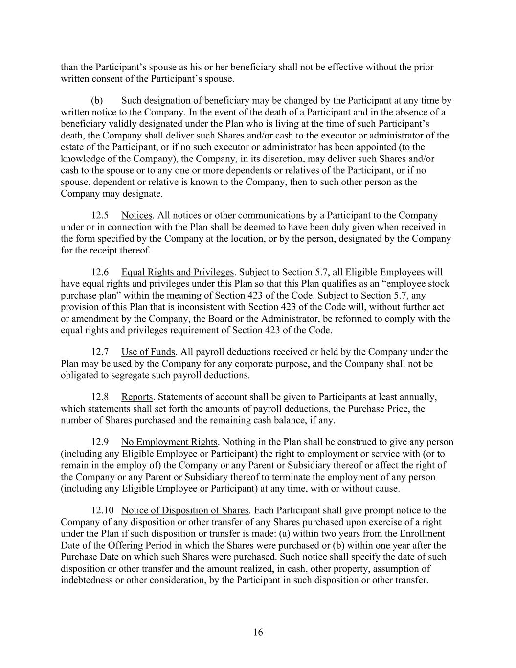 16 than the Participant’s spouse as his or her beneficiary shall not be effective without the prior written consent of the Participant’s spouse. (b) Such designation of beneficiary may be changed by the Participant at any time by written notice to the Company. In the event of the death of a Participant and in the absence of a beneficiary validly designated under the Plan who is living at the time of such Participant’s death, the Company shall deliver such Shares and/or cash to the executor or administrator of the estate of the Participant, or if no such executor or administrator has been appointed (to the knowledge of the Company), the Company, in its discretion, may deliver such Shares and/or cash to the spouse or to any one or more dependents or relatives of the Participant, or if no spouse, dependent or relative is known to the Company, then to such other person as the Company may designate. 12.5 Notices. All notices or other communications by a Participant to the Company under or in connection with the Plan shall be deemed to have been duly given when received in the form specified by the Company at the location, or by the person, designated by the Company for the receipt thereof. 12.6 Equal Rights and Privileges. Subject to Section 5.7, all Eligible Employees will have equal rights and privileges under this Plan so that this Plan qualifies as an “employee stock purchase plan” within the meaning of Section 423 of the Code. Subject to Section 5.7, any provision of this Plan that is inconsistent with Section 423 of the Code will, without further act or amendment by the Company, the Board or the Administrator, be reformed to comply with the equal rights and privileges requirement of Section 423 of the Code. 12.7 Use of Funds. All payroll deductions received or held by the Company under the Plan may be used by the Company for any corporate purpose, and the Company shall not be obligated to segregate such payroll deductions. 12.8 Reports. Statements of account shall be given to Participants at least annually, which statements shall set forth the amounts of payroll deductions, the Purchase Price, the number of Shares purchased and the remaining cash balance, if any. 12.9 No Employment Rights. Nothing in the Plan shall be construed to give any person (including any Eligible Employee or Participant) the right to employment or service with (or to remain in the employ of) the Company or any Parent or Subsidiary thereof or affect the right of the Company or any Parent or Subsidiary thereof to terminate the employment of any person (including any Eligible Employee or Participant) at any time, with or without cause. 12.10 Notice of Disposition of Shares. Each Participant shall give prompt notice to the Company of any disposition or other transfer of any Shares purchased upon exercise of a right under the Plan if such disposition or transfer is made: (a) within two years from the Enrollment Date of the Offering Period in which the Shares were purchased or (b) within one year after the Purchase Date on which such Shares were purchased. Such notice shall specify the date of such disposition or other transfer and the amount realized, in cash, other property, assumption of indebtedness or other consideration, by the Participant in such disposition or other transfer.