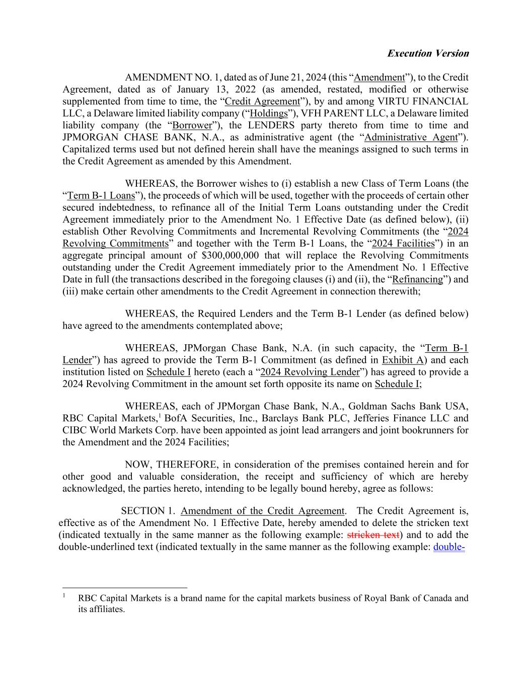 Execution Version AMENDMENT NO. 1, dated as of June 21, 2024 (this “Amendment”), to the Credit Agreement, dated as of January 13, 2022 (as amended, restated, modified or otherwise supplemented from time to time, the “Credit Agreement”), by and among VIRTU FINANCIAL LLC, a Delaware limited liability company (“Holdings”), VFH PARENT LLC, a Delaware limited liability company (the “Borrower”), the LENDERS party thereto from time to time and JPMORGAN CHASE BANK, N.A., as administrative agent (the “Administrative Agent”). Capitalized terms used but not defined herein shall have the meanings assigned to such terms in the Credit Agreement as amended by this Amendment. WHEREAS, the Borrower wishes to (i) establish a new Class of Term Loans (the “Term B-1 Loans”), the proceeds of which will be used, together with the proceeds of certain other secured indebtedness, to refinance all of the Initial Term Loans outstanding under the Credit Agreement immediately prior to the Amendment No. 1 Effective Date (as defined below), (ii) establish Other Revolving Commitments and Incremental Revolving Commitments (the “2024 Revolving Commitments” and together with the Term B-1 Loans, the “2024 Facilities”) in an aggregate principal amount of $300,000,000 that will replace the Revolving Commitments outstanding under the Credit Agreement immediately prior to the Amendment No. 1 Effective Date in full (the transactions described in the foregoing clauses (i) and (ii), the “Refinancing”) and (iii) make certain other amendments to the Credit Agreement in connection therewith; WHEREAS, the Required Lenders and the Term B-1 Lender (as defined below) have agreed to the amendments contemplated above; WHEREAS, JPMorgan Chase Bank, N.A. (in such capacity, the “Term B-1 Lender”) has agreed to provide the Term B-1 Commitment (as defined in Exhibit A) and each institution listed on Schedule I hereto (each a “2024 Revolving Lender”) has agreed to provide a 2024 Revolving Commitment in the amount set forth opposite its name on Schedule I; WHEREAS, each of JPMorgan Chase Bank, N.A., Goldman Sachs Bank USA, RBC Capital Markets,1 BofA Securities, Inc., Barclays Bank PLC, Jefferies Finance LLC and CIBC World Markets Corp. have been appointed as joint lead arrangers and joint bookrunners for the Amendment and the 2024 Facilities; NOW, THEREFORE, in consideration of the premises contained herein and for other good and valuable consideration, the receipt and sufficiency of which are hereby acknowledged, the parties hereto, intending to be legally bound hereby, agree as follows: SECTION 1. Amendment of the Credit Agreement. The Credit Agreement is, effective as of the Amendment No. 1 Effective Date, hereby amended to delete the stricken text (indicated textually in the same manner as the following example: stricken text) and to add the double-underlined text (indicated textually in the same manner as the following example: double- 1 RBC Capital Markets is a brand name for the capital markets business of Royal Bank of Canada and its affiliates.