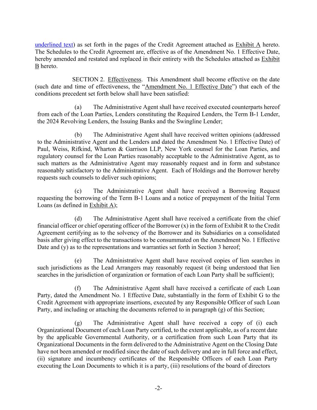 -2- underlined text) as set forth in the pages of the Credit Agreement attached as Exhibit A hereto. The Schedules to the Credit Agreement are, effective as of the Amendment No. 1 Effective Date, hereby amended and restated and replaced in their entirety with the Schedules attached as Exhibit B hereto. SECTION 2. Effectiveness. This Amendment shall become effective on the date (such date and time of effectiveness, the “Amendment No. 1 Effective Date”) that each of the conditions precedent set forth below shall have been satisfied: (a) The Administrative Agent shall have received executed counterparts hereof from each of the Loan Parties, Lenders constituting the Required Lenders, the Term B-1 Lender, the 2024 Revolving Lenders, the Issuing Banks and the Swingline Lender; (b) The Administrative Agent shall have received written opinions (addressed to the Administrative Agent and the Lenders and dated the Amendment No. 1 Effective Date) of Paul, Weiss, Rifkind, Wharton & Garrison LLP, New York counsel for the Loan Parties, and regulatory counsel for the Loan Parties reasonably acceptable to the Administrative Agent, as to such matters as the Administrative Agent may reasonably request and in form and substance reasonably satisfactory to the Administrative Agent. Each of Holdings and the Borrower hereby requests such counsels to deliver such opinions; (c) The Administrative Agent shall have received a Borrowing Request requesting the borrowing of the Term B-1 Loans and a notice of prepayment of the Initial Term Loans (as defined in Exhibit A); (d) The Administrative Agent shall have received a certificate from the chief financial officer or chief operating officer of the Borrower (x) in the form of Exhibit R to the Credit Agreement certifying as to the solvency of the Borrower and its Subsidiaries on a consolidated basis after giving effect to the transactions to be consummated on the Amendment No. 1 Effective Date and (y) as to the representations and warranties set forth in Section 3 hereof; (e) The Administrative Agent shall have received copies of lien searches in such jurisdictions as the Lead Arrangers may reasonably request (it being understood that lien searches in the jurisdiction of organization or formation of each Loan Party shall be sufficient); (f) The Administrative Agent shall have received a certificate of each Loan Party, dated the Amendment No. 1 Effective Date, substantially in the form of Exhibit G to the Credit Agreement with appropriate insertions, executed by any Responsible Officer of such Loan Party, and including or attaching the documents referred to in paragraph (g) of this Section; (g) The Administrative Agent shall have received a copy of (i) each Organizational Document of each Loan Party certified, to the extent applicable, as of a recent date by the applicable Governmental Authority, or a certification from such Loan Party that its Organizational Documents in the form delivered to the Administrative Agent on the Closing Date have not been amended or modified since the date of such delivery and are in full force and effect, (ii) signature and incumbency certificates of the Responsible Officers of each Loan Party executing the Loan Documents to which it is a party, (iii) resolutions of the board of directors