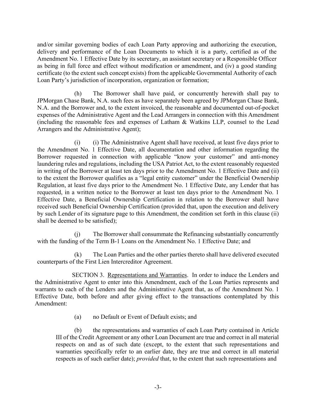 -3- and/or similar governing bodies of each Loan Party approving and authorizing the execution, delivery and performance of the Loan Documents to which it is a party, certified as of the Amendment No. 1 Effective Date by its secretary, an assistant secretary or a Responsible Officer as being in full force and effect without modification or amendment, and (iv) a good standing certificate (to the extent such concept exists) from the applicable Governmental Authority of each Loan Party’s jurisdiction of incorporation, organization or formation; (h) The Borrower shall have paid, or concurrently herewith shall pay to JPMorgan Chase Bank, N.A. such fees as have separately been agreed by JPMorgan Chase Bank, N.A. and the Borrower and, to the extent invoiced, the reasonable and documented out-of-pocket expenses of the Administrative Agent and the Lead Arrangers in connection with this Amendment (including the reasonable fees and expenses of Latham & Watkins LLP, counsel to the Lead Arrangers and the Administrative Agent); (i) (i) The Administrative Agent shall have received, at least five days prior to the Amendment No. 1 Effective Date, all documentation and other information regarding the Borrower requested in connection with applicable “know your customer” and anti-money laundering rules and regulations, including the USA Patriot Act, to the extent reasonably requested in writing of the Borrower at least ten days prior to the Amendment No. 1 Effective Date and (ii) to the extent the Borrower qualifies as a “legal entity customer” under the Beneficial Ownership Regulation, at least five days prior to the Amendment No. 1 Effective Date, any Lender that has requested, in a written notice to the Borrower at least ten days prior to the Amendment No. 1 Effective Date, a Beneficial Ownership Certification in relation to the Borrower shall have received such Beneficial Ownership Certification (provided that, upon the execution and delivery by such Lender of its signature page to this Amendment, the condition set forth in this clause (ii) shall be deemed to be satisfied); (j) The Borrower shall consummate the Refinancing substantially concurrently with the funding of the Term B-1 Loans on the Amendment No. 1 Effective Date; and (k) The Loan Parties and the other parties thereto shall have delivered executed counterparts of the First Lien Intercreditor Agreement. SECTION 3. Representations and Warranties. In order to induce the Lenders and the Administrative Agent to enter into this Amendment, each of the Loan Parties represents and warrants to each of the Lenders and the Administrative Agent that, as of the Amendment No. 1 Effective Date, both before and after giving effect to the transactions contemplated by this Amendment: (a) no Default or Event of Default exists; and (b) the representations and warranties of each Loan Party contained in Article III of the Credit Agreement or any other Loan Document are true and correct in all material respects on and as of such date (except, to the extent that such representations and warranties specifically refer to an earlier date, they are true and correct in all material respects as of such earlier date); provided that, to the extent that such representations and