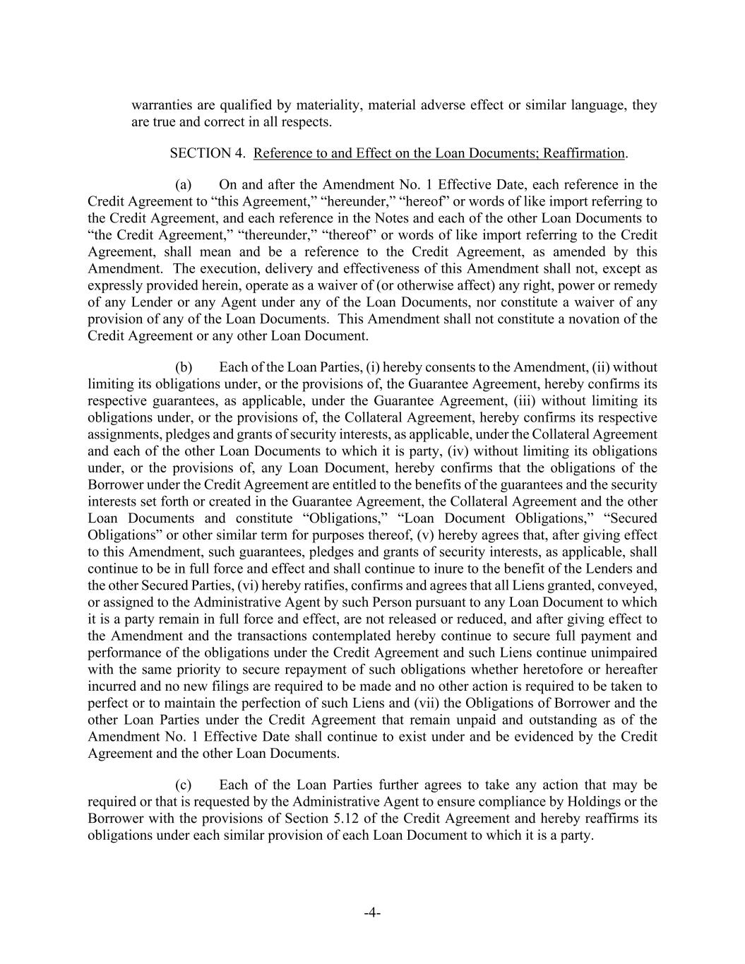 -4- warranties are qualified by materiality, material adverse effect or similar language, they are true and correct in all respects. SECTION 4. Reference to and Effect on the Loan Documents; Reaffirmation. (a) On and after the Amendment No. 1 Effective Date, each reference in the Credit Agreement to “this Agreement,” “hereunder,” “hereof” or words of like import referring to the Credit Agreement, and each reference in the Notes and each of the other Loan Documents to “the Credit Agreement,” “thereunder,” “thereof” or words of like import referring to the Credit Agreement, shall mean and be a reference to the Credit Agreement, as amended by this Amendment. The execution, delivery and effectiveness of this Amendment shall not, except as expressly provided herein, operate as a waiver of (or otherwise affect) any right, power or remedy of any Lender or any Agent under any of the Loan Documents, nor constitute a waiver of any provision of any of the Loan Documents. This Amendment shall not constitute a novation of the Credit Agreement or any other Loan Document. (b) Each of the Loan Parties, (i) hereby consents to the Amendment, (ii) without limiting its obligations under, or the provisions of, the Guarantee Agreement, hereby confirms its respective guarantees, as applicable, under the Guarantee Agreement, (iii) without limiting its obligations under, or the provisions of, the Collateral Agreement, hereby confirms its respective assignments, pledges and grants of security interests, as applicable, under the Collateral Agreement and each of the other Loan Documents to which it is party, (iv) without limiting its obligations under, or the provisions of, any Loan Document, hereby confirms that the obligations of the Borrower under the Credit Agreement are entitled to the benefits of the guarantees and the security interests set forth or created in the Guarantee Agreement, the Collateral Agreement and the other Loan Documents and constitute “Obligations,” “Loan Document Obligations,” “Secured Obligations” or other similar term for purposes thereof, (v) hereby agrees that, after giving effect to this Amendment, such guarantees, pledges and grants of security interests, as applicable, shall continue to be in full force and effect and shall continue to inure to the benefit of the Lenders and the other Secured Parties, (vi) hereby ratifies, confirms and agrees that all Liens granted, conveyed, or assigned to the Administrative Agent by such Person pursuant to any Loan Document to which it is a party remain in full force and effect, are not released or reduced, and after giving effect to the Amendment and the transactions contemplated hereby continue to secure full payment and performance of the obligations under the Credit Agreement and such Liens continue unimpaired with the same priority to secure repayment of such obligations whether heretofore or hereafter incurred and no new filings are required to be made and no other action is required to be taken to perfect or to maintain the perfection of such Liens and (vii) the Obligations of Borrower and the other Loan Parties under the Credit Agreement that remain unpaid and outstanding as of the Amendment No. 1 Effective Date shall continue to exist under and be evidenced by the Credit Agreement and the other Loan Documents. (c) Each of the Loan Parties further agrees to take any action that may be required or that is requested by the Administrative Agent to ensure compliance by Holdings or the Borrower with the provisions of Section 5.12 of the Credit Agreement and hereby reaffirms its obligations under each similar provision of each Loan Document to which it is a party.