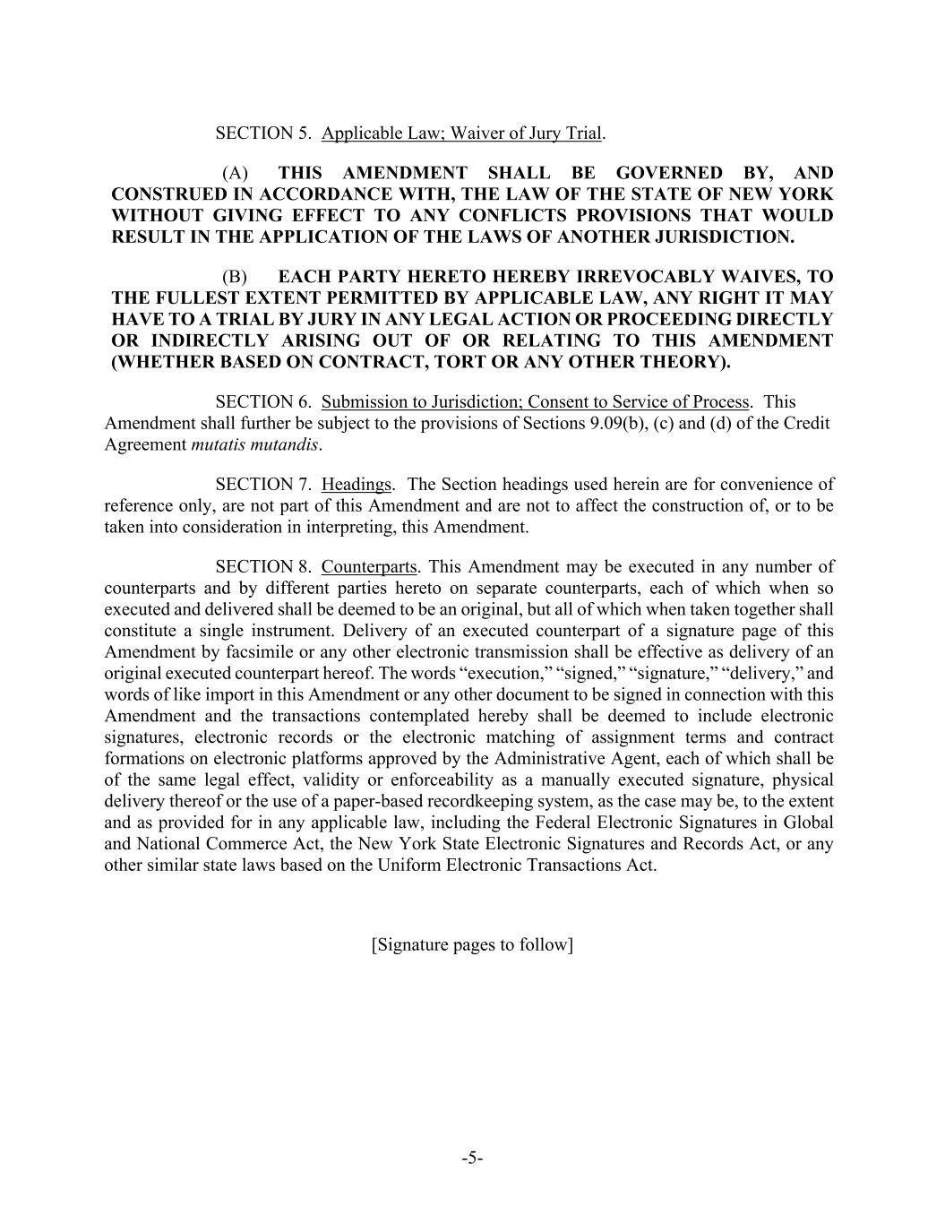 -5- SECTION 5. Applicable Law; Waiver of Jury Trial. (A) THIS AMENDMENT SHALL BE GOVERNED BY, AND CONSTRUED IN ACCORDANCE WITH, THE LAW OF THE STATE OF NEW YORK WITHOUT GIVING EFFECT TO ANY CONFLICTS PROVISIONS THAT WOULD RESULT IN THE APPLICATION OF THE LAWS OF ANOTHER JURISDICTION. (B) EACH PARTY HERETO HEREBY IRREVOCABLY WAIVES, TO THE FULLEST EXTENT PERMITTED BY APPLICABLE LAW, ANY RIGHT IT MAY HAVE TO A TRIAL BY JURY IN ANY LEGAL ACTION OR PROCEEDING DIRECTLY OR INDIRECTLY ARISING OUT OF OR RELATING TO THIS AMENDMENT (WHETHER BASED ON CONTRACT, TORT OR ANY OTHER THEORY). SECTION 6. Submission to Jurisdiction; Consent to Service of Process. This Amendment shall further be subject to the provisions of Sections 9.09(b), (c) and (d) of the Credit Agreement mutatis mutandis. SECTION 7. Headings. The Section headings used herein are for convenience of reference only, are not part of this Amendment and are not to affect the construction of, or to be taken into consideration in interpreting, this Amendment. SECTION 8. Counterparts. This Amendment may be executed in any number of counterparts and by different parties hereto on separate counterparts, each of which when so executed and delivered shall be deemed to be an original, but all of which when taken together shall constitute a single instrument. Delivery of an executed counterpart of a signature page of this Amendment by facsimile or any other electronic transmission shall be effective as delivery of an original executed counterpart hereof. The words “execution,” “signed,” “signature,” “delivery,” and words of like import in this Amendment or any other document to be signed in connection with this Amendment and the transactions contemplated hereby shall be deemed to include electronic signatures, electronic records or the electronic matching of assignment terms and contract formations on electronic platforms approved by the Administrative Agent, each of which shall be of the same legal effect, validity or enforceability as a manually executed signature, physical delivery thereof or the use of a paper-based recordkeeping system, as the case may be, to the extent and as provided for in any applicable law, including the Federal Electronic Signatures in Global and National Commerce Act, the New York State Electronic Signatures and Records Act, or any other similar state laws based on the Uniform Electronic Transactions Act. [Signature pages to follow]
