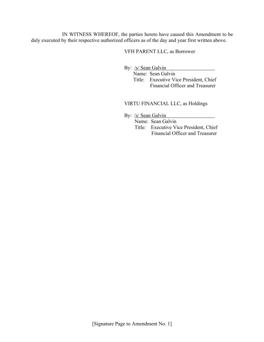 [Signature Page to Amendment No. 1] IN WITNESS WHEREOF, the parties hereto have caused this Amendment to be duly executed by their respective authorized officers as of the day and year first written above. VFH PARENT LLC, as Borrower By: /s/ Sean Galvin Name: Sean Galvin Title: Executive Vice President, Chief Financial Officer and Treasurer VIRTU FINANCIAL LLC, as Holdings By: /s/ Sean Galvin Name: Sean Galvin Title: Executive Vice President, Chief Financial Officer and Treasurer