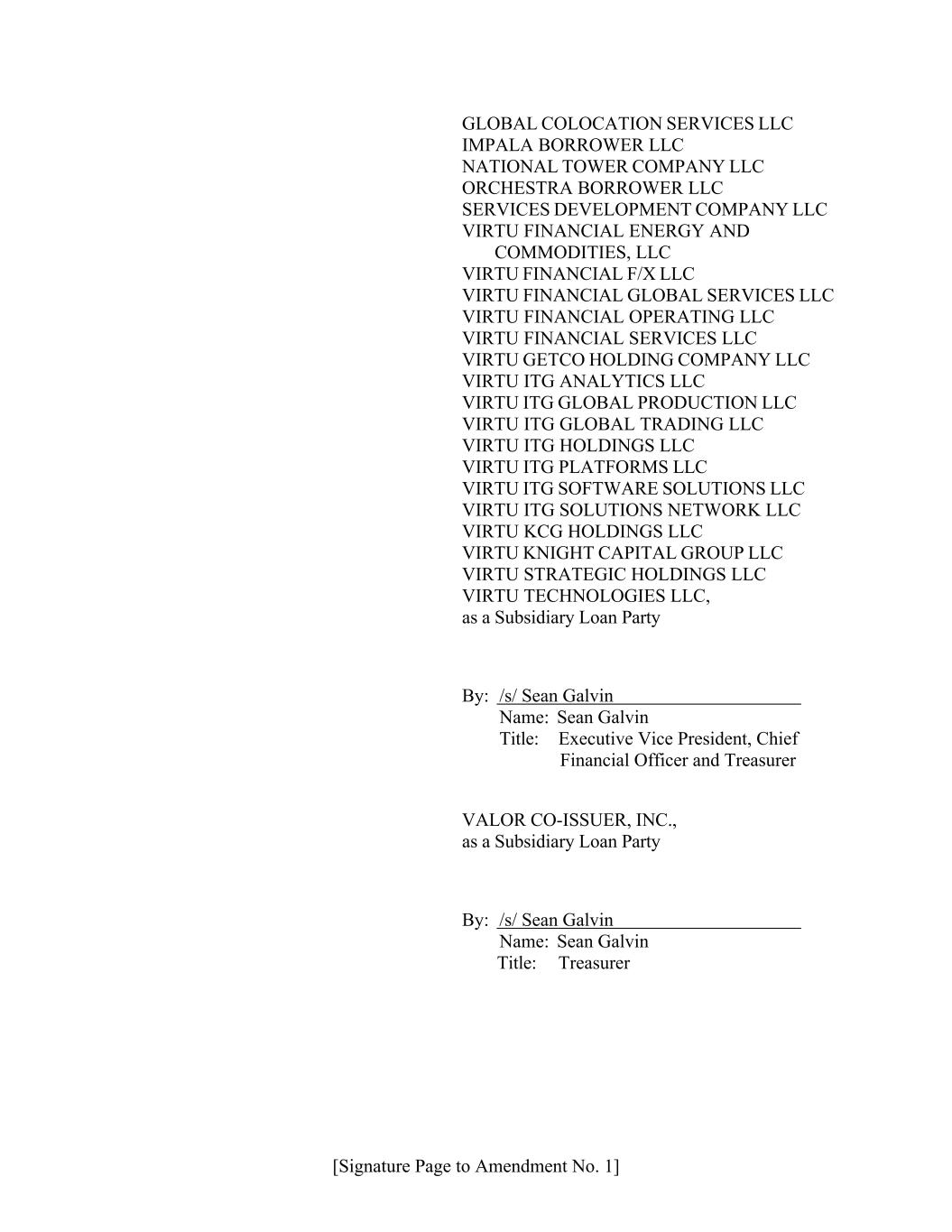 [Signature Page to Amendment No. 1] GLOBAL COLOCATION SERVICES LLC IMPALA BORROWER LLC NATIONAL TOWER COMPANY LLC ORCHESTRA BORROWER LLC SERVICES DEVELOPMENT COMPANY LLC VIRTU FINANCIAL ENERGY AND COMMODITIES, LLC VIRTU FINANCIAL F/X LLC VIRTU FINANCIAL GLOBAL SERVICES LLC VIRTU FINANCIAL OPERATING LLC VIRTU FINANCIAL SERVICES LLC VIRTU GETCO HOLDING COMPANY LLC VIRTU ITG ANALYTICS LLC VIRTU ITG GLOBAL PRODUCTION LLC VIRTU ITG GLOBAL TRADING LLC VIRTU ITG HOLDINGS LLC VIRTU ITG PLATFORMS LLC VIRTU ITG SOFTWARE SOLUTIONS LLC VIRTU ITG SOLUTIONS NETWORK LLC VIRTU KCG HOLDINGS LLC VIRTU KNIGHT CAPITAL GROUP LLC VIRTU STRATEGIC HOLDINGS LLC VIRTU TECHNOLOGIES LLC, as a Subsidiary Loan Party By: /s/ Sean Galvin Name: Sean Galvin Title: Executive Vice President, Chief Financial Officer and Treasurer VALOR CO-ISSUER, INC., as a Subsidiary Loan Party By: /s/ Sean Galvin Name: Sean Galvin Title: Treasurer