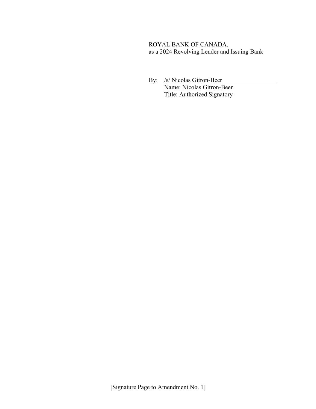 [Signature Page to Amendment No. 1] ROYAL BANK OF CANADA, as a 2024 Revolving Lender and Issuing Bank By: /s/ Nicolas Gitron-Beer Name: Nicolas Gitron-Beer Title: Authorized Signatory