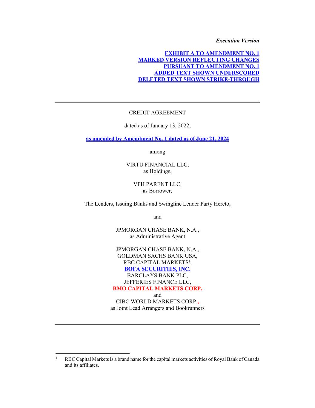 Execution Version EXHIBIT A TO AMENDMENT NO. 1 MARKED VERSION REFLECTING CHANGES PURSUANT TO AMENDMENT NO. 1 ADDED TEXT SHOWN UNDERSCORED DELETED TEXT SHOWN STRIKE-THROUGH CREDIT AGREEMENT dated as of January 13, 2022, as amended by Amendment No. 1 dated as of June 21, 2024 among VIRTU FINANCIAL LLC, as Holdings, VFH PARENT LLC, as Borrower, The Lenders, Issuing Banks and Swingline Lender Party Hereto, and JPMORGAN CHASE BANK, N.A., as Administrative Agent JPMORGAN CHASE BANK, N.A., GOLDMAN SACHS BANK USA, RBC CAPITAL MARKETS1, BOFA SECURITIES, INC. BARCLAYS BANK PLC, JEFFERIES FINANCE LLC, BMO CAPITAL MARKETS CORP. and CIBC WORLD MARKETS CORP., as Joint Lead Arrangers and Bookrunners 1 RBC Capital Markets is a brand name for the capital markets activities of Royal Bank of Canada and its affiliates.