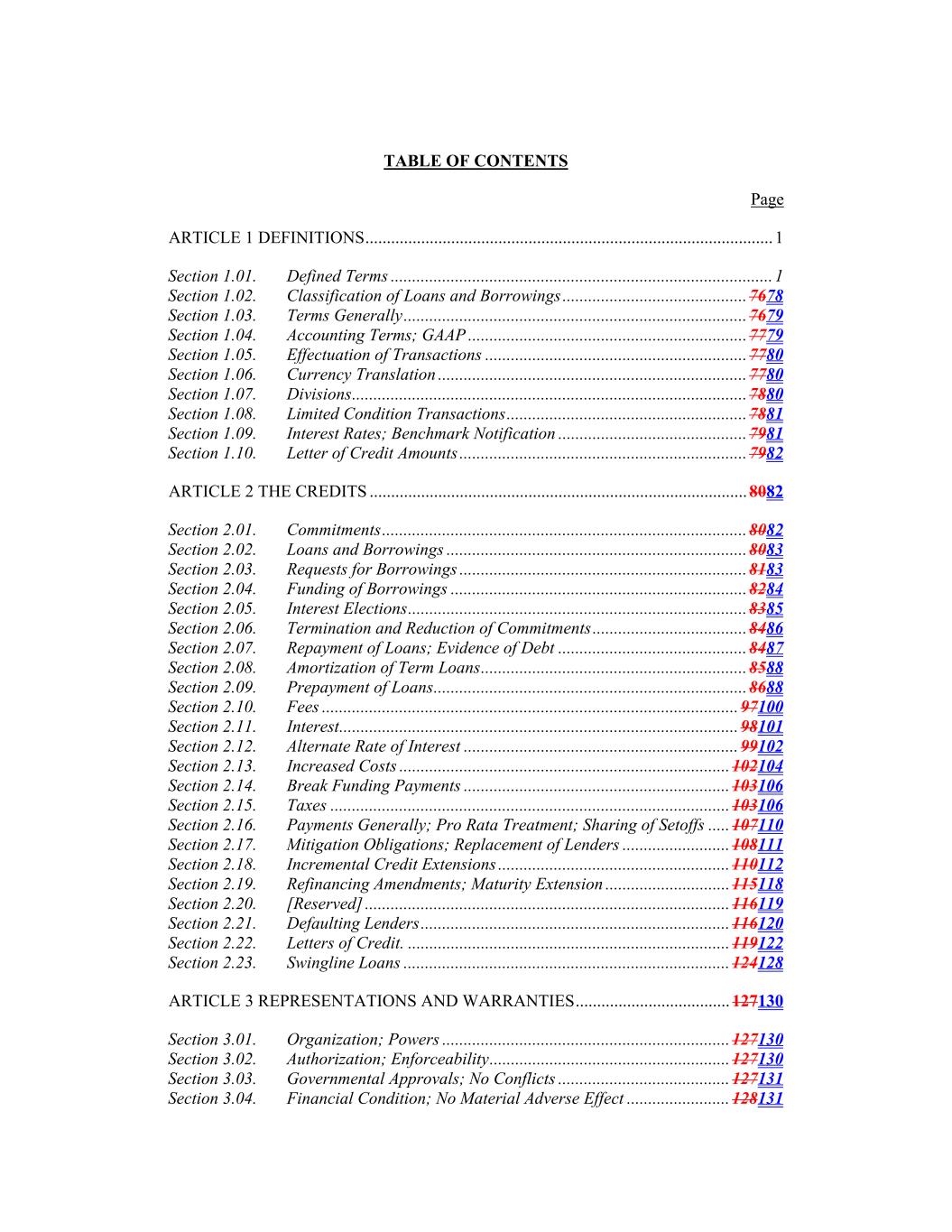 TABLE OF CONTENTS Page ARTICLE 1 DEFINITIONS ............................................................................................... 1  Section 1.01.  Defined Terms ......................................................................................... 1  Section 1.02.  Classification of Loans and Borrowings ........................................... 7678  Section 1.03.  Terms Generally ................................................................................ 7679  Section 1.04.  Accounting Terms; GAAP ................................................................. 7779  Section 1.05.  Effectuation of Transactions ............................................................. 7780  Section 1.06.  Currency Translation ........................................................................ 7780  Section 1.07.  Divisions ............................................................................................ 7880  Section 1.08.  Limited Condition Transactions ........................................................ 7881  Section 1.09.  Interest Rates; Benchmark Notification ............................................ 7981  Section 1.10.  Letter of Credit Amounts ................................................................... 7982  ARTICLE 2 THE CREDITS ........................................................................................ 8082  Section 2.01.  Commitments ..................................................................................... 8082  Section 2.02.  Loans and Borrowings ...................................................................... 8083  Section 2.03.  Requests for Borrowings ................................................................... 8183  Section 2.04.  Funding of Borrowings ..................................................................... 8284  Section 2.05.  Interest Elections ............................................................................... 8385  Section 2.06.  Termination and Reduction of Commitments .................................... 8486  Section 2.07.  Repayment of Loans; Evidence of Debt ............................................ 8487  Section 2.08.  Amortization of Term Loans .............................................................. 8588  Section 2.09.  Prepayment of Loans ......................................................................... 8688  Section 2.10.  Fees ................................................................................................. 97100  Section 2.11.  Interest ............................................................................................. 98101  Section 2.12.  Alternate Rate of Interest ................................................................ 99102  Section 2.13.  Increased Costs ............................................................................. 102104  Section 2.14.  Break Funding Payments .............................................................. 103106  Section 2.15.  Taxes ............................................................................................. 103106  Section 2.16.  Payments Generally; Pro Rata Treatment; Sharing of Setoffs ..... 107110  Section 2.17.  Mitigation Obligations; Replacement of Lenders ......................... 108111  Section 2.18.  Incremental Credit Extensions ...................................................... 110112  Section 2.19.  Refinancing Amendments; Maturity Extension ............................. 115118  Section 2.20.  [Reserved] ..................................................................................... 116119  Section 2.21.  Defaulting Lenders ........................................................................ 116120  Section 2.22.  Letters of Credit. ........................................................................... 119122  Section 2.23.  Swingline Loans ............................................................................ 124128  ARTICLE 3 REPRESENTATIONS AND WARRANTIES .................................... 127130  Section 3.01.  Organization; Powers ................................................................... 127130  Section 3.02.  Authorization; Enforceability ........................................................ 127130  Section 3.03.  Governmental Approvals; No Conflicts ........................................ 127131  Section 3.04.  Financial Condition; No Material Adverse Effect ........................ 128131