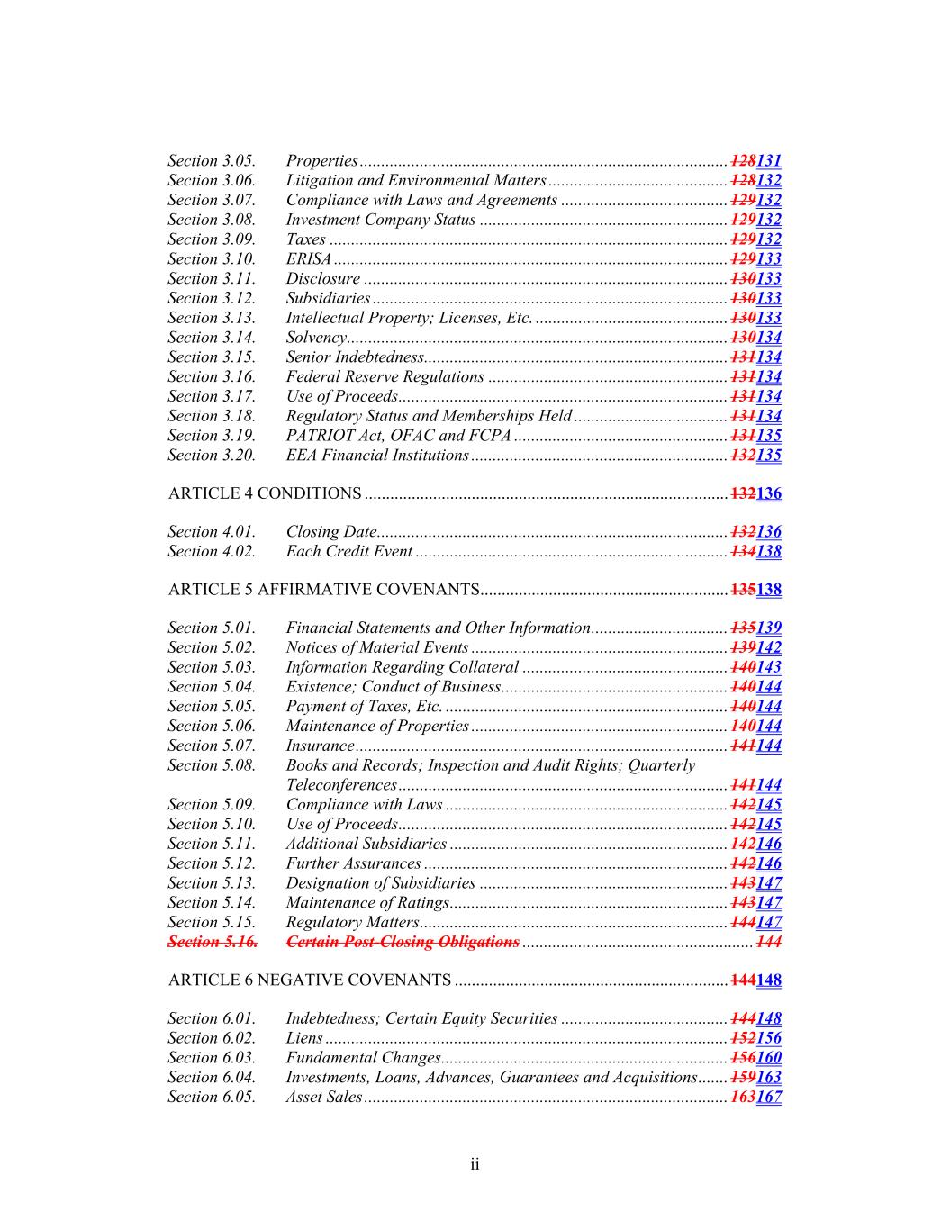 ii Section 3.05.  Properties ...................................................................................... 128131  Section 3.06.  Litigation and Environmental Matters .......................................... 128132  Section 3.07.  Compliance with Laws and Agreements ....................................... 129132  Section 3.08.  Investment Company Status .......................................................... 129132  Section 3.09.  Taxes ............................................................................................. 129132  Section 3.10.  ERISA ............................................................................................ 129133  Section 3.11.  Disclosure ..................................................................................... 130133  Section 3.12.  Subsidiaries ................................................................................... 130133  Section 3.13.  Intellectual Property; Licenses, Etc. ............................................. 130133  Section 3.14.  Solvency ......................................................................................... 130134  Section 3.15.  Senior Indebtedness....................................................................... 131134  Section 3.16.  Federal Reserve Regulations ........................................................ 131134  Section 3.17.  Use of Proceeds ............................................................................. 131134  Section 3.18.  Regulatory Status and Memberships Held .................................... 131134  Section 3.19.  PATRIOT Act, OFAC and FCPA .................................................. 131135  Section 3.20.  EEA Financial Institutions ............................................................ 132135  ARTICLE 4 CONDITIONS ..................................................................................... 132136  Section 4.01.  Closing Date .................................................................................. 132136  Section 4.02.  Each Credit Event ......................................................................... 134138  ARTICLE 5 AFFIRMATIVE COVENANTS.......................................................... 135138  Section 5.01.  Financial Statements and Other Information ................................ 135139  Section 5.02.  Notices of Material Events ............................................................ 139142  Section 5.03.  Information Regarding Collateral ................................................ 140143  Section 5.04.  Existence; Conduct of Business ..................................................... 140144  Section 5.05.  Payment of Taxes, Etc. .................................................................. 140144  Section 5.06.  Maintenance of Properties ............................................................ 140144  Section 5.07.  Insurance ....................................................................................... 141144  Section 5.08.  Books and Records; Inspection and Audit Rights; Quarterly Teleconferences ............................................................................. 141144  Section 5.09.  Compliance with Laws .................................................................. 142145  Section 5.10.  Use of Proceeds ............................................................................. 142145  Section 5.11.  Additional Subsidiaries ................................................................. 142146  Section 5.12.  Further Assurances ....................................................................... 142146  Section 5.13.  Designation of Subsidiaries .......................................................... 143147  Section 5.14.  Maintenance of Ratings ................................................................. 143147  Section 5.15.  Regulatory Matters ........................................................................ 144147  Section 5.16.  Certain Post-Closing Obligations ...................................................... 144 ARTICLE 6 NEGATIVE COVENANTS ................................................................ 144148  Section 6.01.  Indebtedness; Certain Equity Securities ....................................... 144148  Section 6.02.  Liens .............................................................................................. 152156  Section 6.03.  Fundamental Changes ................................................................... 156160  Section 6.04.  Investments, Loans, Advances, Guarantees and Acquisitions ....... 159163  Section 6.05.  Asset Sales ..................................................................................... 163167