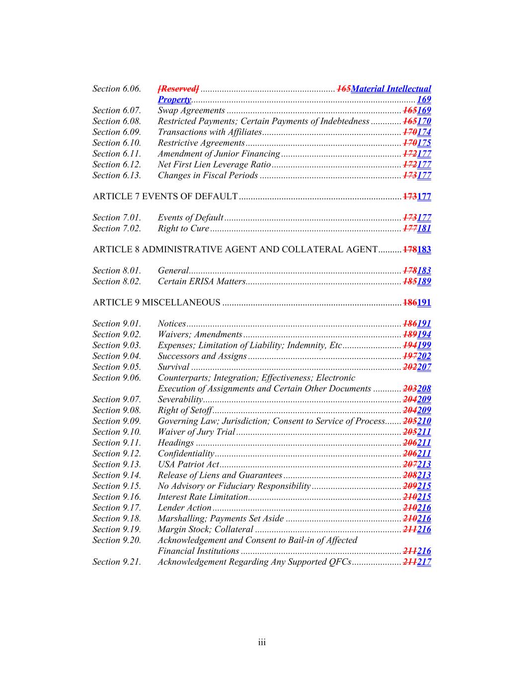 iii Section 6.06.  [Reserved] ......................................................... 165Material Intellectual Property ............................................................................................... 169  Section 6.07.  Swap Agreements .......................................................................... 165169  Section 6.08.  Restricted Payments; Certain Payments of Indebtedness ............. 165170  Section 6.09.  Transactions with Affiliates ........................................................... 170174  Section 6.10.  Restrictive Agreements .................................................................. 170175  Section 6.11.  Amendment of Junior Financing ................................................... 172177  Section 6.12.  Net First Lien Leverage Ratio ....................................................... 172177  Section 6.13.  Changes in Fiscal Periods ............................................................ 173177  ARTICLE 7 EVENTS OF DEFAULT ..................................................................... 173177  Section 7.01.  Events of Default ........................................................................... 173177  Section 7.02.  Right to Cure ................................................................................. 177181  ARTICLE 8 ADMINISTRATIVE AGENT AND COLLATERAL AGENT .......... 178183  Section 8.01.  General .......................................................................................... 178183  Section 8.02.  Certain ERISA Matters .................................................................. 185189  ARTICLE 9 MISCELLANEOUS ............................................................................ 186191  Section 9.01.  Notices ........................................................................................... 186191  Section 9.02.  Waivers; Amendments ................................................................... 189194  Section 9.03.  Expenses; Limitation of Liability; Indemnity, Etc ......................... 194199  Section 9.04.  Successors and Assigns ................................................................. 197202  Section 9.05.  Survival ......................................................................................... 202207  Section 9.06.  Counterparts; Integration; Effectiveness; Electronic Execution of Assignments and Certain Other Documents ............ 203208  Section 9.07.  Severability .................................................................................... 204209  Section 9.08.  Right of Setoff ................................................................................ 204209  Section 9.09.  Governing Law; Jurisdiction; Consent to Service of Process ....... 205210  Section 9.10.  Waiver of Jury Trial ...................................................................... 205211  Section 9.11.  Headings ....................................................................................... 206211  Section 9.12.  Confidentiality ............................................................................... 206211  Section 9.13.  USA Patriot Act ............................................................................. 207213  Section 9.14.  Release of Liens and Guarantees .................................................. 208213  Section 9.15.  No Advisory or Fiduciary Responsibility ...................................... 209215  Section 9.16.  Interest Rate Limitation ................................................................. 210215  Section 9.17.  Lender Action ................................................................................ 210216  Section 9.18.  Marshalling; Payments Set Aside ................................................. 210216  Section 9.19.  Margin Stock; Collateral .............................................................. 211216  Section 9.20.  Acknowledgement and Consent to Bail-in of Affected Financial Institutions .................................................................... 211216  Section 9.21.  Acknowledgement Regarding Any Supported QFCs ..................... 211217