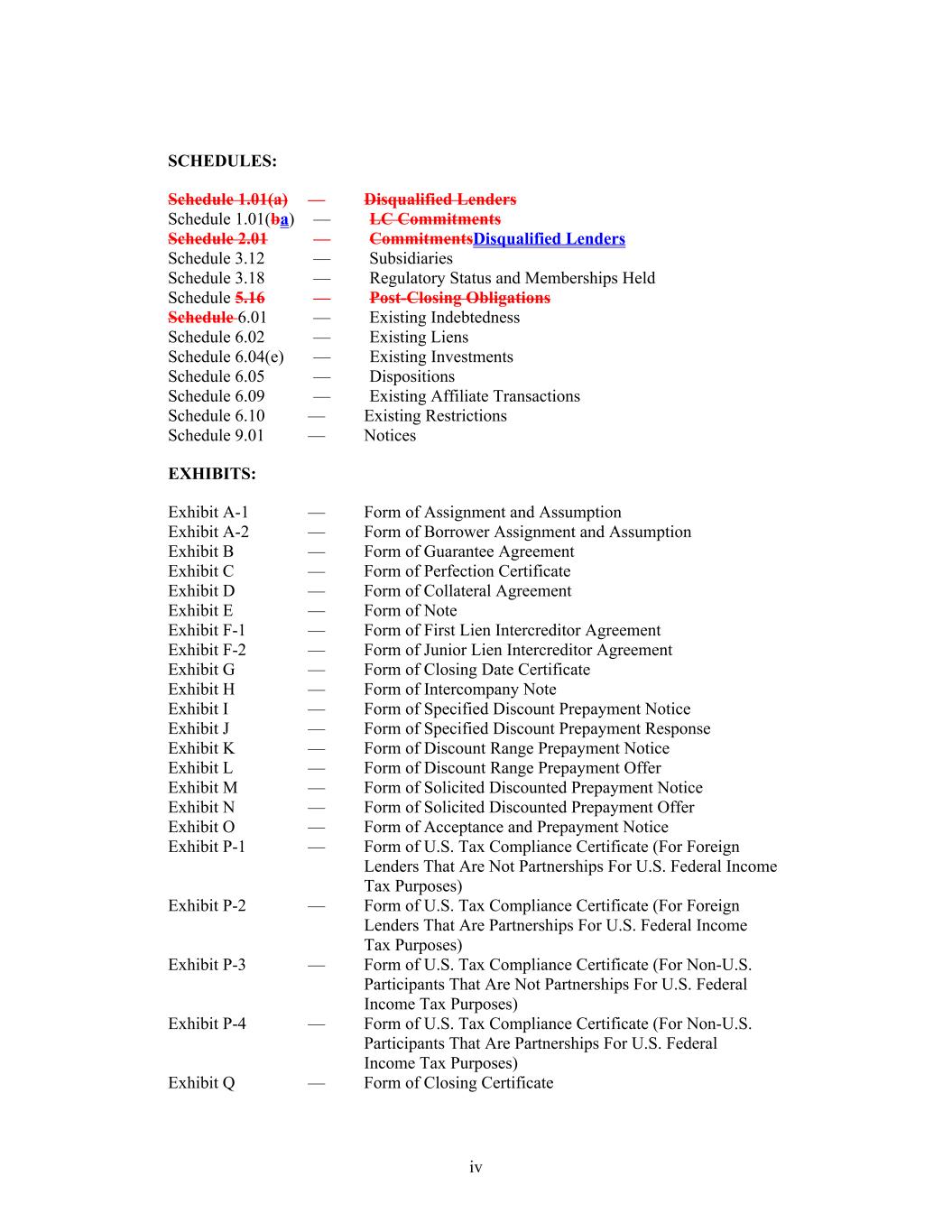 iv SCHEDULES: Schedule 1.01(a) — Disqualified Lenders Schedule 1.01(ba) — LC Commitments Schedule 2.01 — CommitmentsDisqualified Lenders Schedule 3.12 — Subsidiaries Schedule 3.18 — Regulatory Status and Memberships Held Schedule 5.16 — Post-Closing Obligations Schedule 6.01 — Existing Indebtedness Schedule 6.02 — Existing Liens Schedule 6.04(e) — Existing Investments Schedule 6.05 — Dispositions Schedule 6.09 — Existing Affiliate Transactions Schedule 6.10 — Existing Restrictions Schedule 9.01 — Notices EXHIBITS: Exhibit A-1 — Form of Assignment and Assumption Exhibit A-2 — Form of Borrower Assignment and Assumption Exhibit B — Form of Guarantee Agreement Exhibit C — Form of Perfection Certificate Exhibit D — Form of Collateral Agreement Exhibit E — Form of Note Exhibit F-1 — Form of First Lien Intercreditor Agreement Exhibit F-2 — Form of Junior Lien Intercreditor Agreement Exhibit G — Form of Closing Date Certificate Exhibit H — Form of Intercompany Note Exhibit I — Form of Specified Discount Prepayment Notice Exhibit J — Form of Specified Discount Prepayment Response Exhibit K — Form of Discount Range Prepayment Notice Exhibit L — Form of Discount Range Prepayment Offer Exhibit M — Form of Solicited Discounted Prepayment Notice Exhibit N — Form of Solicited Discounted Prepayment Offer Exhibit O — Form of Acceptance and Prepayment Notice Exhibit P-1 — Form of U.S. Tax Compliance Certificate (For Foreign Lenders That Are Not Partnerships For U.S. Federal Income Tax Purposes) Exhibit P-2 — Form of U.S. Tax Compliance Certificate (For Foreign Lenders That Are Partnerships For U.S. Federal Income Tax Purposes) Exhibit P-3 — Form of U.S. Tax Compliance Certificate (For Non-U.S. Participants That Are Not Partnerships For U.S. Federal Income Tax Purposes) Exhibit P-4 — Form of U.S. Tax Compliance Certificate (For Non-U.S. Participants That Are Partnerships For U.S. Federal Income Tax Purposes) Exhibit Q — Form of Closing Certificate