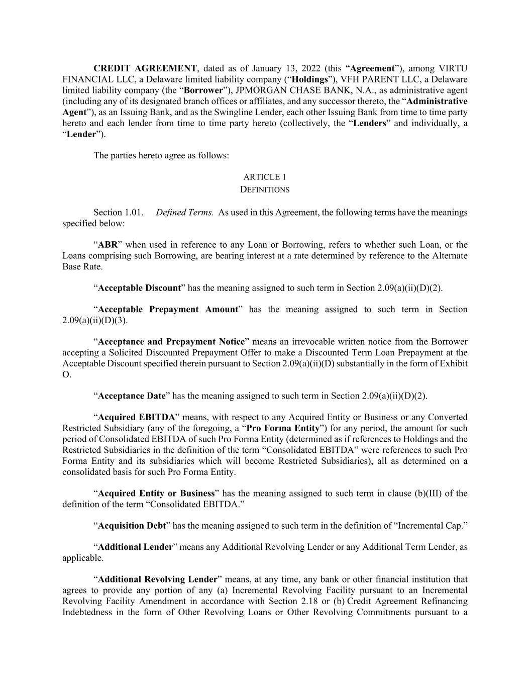 CREDIT AGREEMENT, dated as of January 13, 2022 (this “Agreement”), among VIRTU FINANCIAL LLC, a Delaware limited liability company (“Holdings”), VFH PARENT LLC, a Delaware limited liability company (the “Borrower”), JPMORGAN CHASE BANK, N.A., as administrative agent (including any of its designated branch offices or affiliates, and any successor thereto, the “Administrative Agent”), as an Issuing Bank, and as the Swingline Lender, each other Issuing Bank from time to time party hereto and each lender from time to time party hereto (collectively, the “Lenders” and individually, a “Lender”). The parties hereto agree as follows: ARTICLE 1 DEFINITIONS Section 1.01. Defined Terms. As used in this Agreement, the following terms have the meanings specified below: “ABR” when used in reference to any Loan or Borrowing, refers to whether such Loan, or the Loans comprising such Borrowing, are bearing interest at a rate determined by reference to the Alternate Base Rate. “Acceptable Discount” has the meaning assigned to such term in Section 2.09(a)(ii)(D)(2). “Acceptable Prepayment Amount” has the meaning assigned to such term in Section 2.09(a)(ii)(D)(3). “Acceptance and Prepayment Notice” means an irrevocable written notice from the Borrower accepting a Solicited Discounted Prepayment Offer to make a Discounted Term Loan Prepayment at the Acceptable Discount specified therein pursuant to Section 2.09(a)(ii)(D) substantially in the form of Exhibit O. “Acceptance Date” has the meaning assigned to such term in Section 2.09(a)(ii)(D)(2). “Acquired EBITDA” means, with respect to any Acquired Entity or Business or any Converted Restricted Subsidiary (any of the foregoing, a “Pro Forma Entity”) for any period, the amount for such period of Consolidated EBITDA of such Pro Forma Entity (determined as if references to Holdings and the Restricted Subsidiaries in the definition of the term “Consolidated EBITDA” were references to such Pro Forma Entity and its subsidiaries which will become Restricted Subsidiaries), all as determined on a consolidated basis for such Pro Forma Entity. “Acquired Entity or Business” has the meaning assigned to such term in clause (b)(III) of the definition of the term “Consolidated EBITDA.” “Acquisition Debt” has the meaning assigned to such term in the definition of “Incremental Cap.” “Additional Lender” means any Additional Revolving Lender or any Additional Term Lender, as applicable. “Additional Revolving Lender” means, at any time, any bank or other financial institution that agrees to provide any portion of any (a) Incremental Revolving Facility pursuant to an Incremental Revolving Facility Amendment in accordance with Section 2.18 or (b) Credit Agreement Refinancing Indebtedness in the form of Other Revolving Loans or Other Revolving Commitments pursuant to a