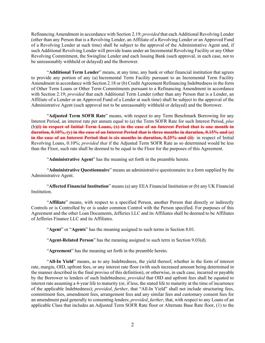 2 Refinancing Amendment in accordance with Section 2.19; provided that each Additional Revolving Lender (other than any Person that is a Revolving Lender, an Affiliate of a Revolving Lender or an Approved Fund of a Revolving Lender at such time) shall be subject to the approval of the Administrative Agent and, if such Additional Revolving Lender will provide loans under an Incremental Revolving Facility or any Other Revolving Commitment, the Swingline Lender and each Issuing Bank (such approval, in each case, not to be unreasonably withheld or delayed) and the Borrower. “Additional Term Lender” means, at any time, any bank or other financial institution that agrees to provide any portion of any (a) Incremental Term Facility pursuant to an Incremental Term Facility Amendment in accordance with Section 2.18 or (b) Credit Agreement Refinancing Indebtedness in the form of Other Term Loans or Other Term Commitments pursuant to a Refinancing Amendment in accordance with Section 2.19; provided that each Additional Term Lender (other than any Person that is a Lender, an Affiliate of a Lender or an Approved Fund of a Lender at such time) shall be subject to the approval of the Administrative Agent (such approval not to be unreasonably withheld or delayed) and the Borrower. “Adjusted Term SOFR Rate” means, with respect to any Term Benchmark Borrowing for any Interest Period, an interest rate per annum equal to (a) the Term SOFR Rate for such Interest Period, plus (b)(i) in respect of Initial Term Loans, (x) in the case of an Interest Period that is one month in duration, 0.10%, (y) in the case of an Interest Period that is three months in duration, 0.15% and (z) in the case of an Interest Period that is six months in duration, 0.25% and (ii) in respect of Initial Revolving Loans, 0.10%; provided that if the Adjusted Term SOFR Rate as so determined would be less than the Floor, such rate shall be deemed to be equal to the Floor for the purposes of this Agreement. “Administrative Agent” has the meaning set forth in the preamble hereto. “Administrative Questionnaire” means an administrative questionnaire in a form supplied by the Administrative Agent. “Affected Financial Institution” means (a) any EEA Financial Institution or (b) any UK Financial Institution. “Affiliate” means, with respect to a specified Person, another Person that directly or indirectly Controls or is Controlled by or is under common Control with the Person specified. For purposes of this Agreement and the other Loan Documents, Jefferies LLC and its Affiliates shall be deemed to be Affiliates of Jefferies Finance LLC and its Affiliates. “Agent” or “Agents” has the meaning assigned to such terms in Section 8.01. “Agent-Related Person” has the meaning assigned to such term in Section 9.03(d). “Agreement” has the meaning set forth in the preamble hereto. “All-In Yield” means, as to any Indebtedness, the yield thereof, whether in the form of interest rate, margin, OID, upfront fees, or any interest rate floor (with such increased amount being determined in the manner described in the final proviso of this definition), or otherwise, in each case, incurred or payable by the Borrower to lenders of such Indebtedness; provided that OID and upfront fees shall be equated to interest rate assuming a 4-year life to maturity (or, if less, the stated life to maturity at the time of incurrence of the applicable Indebtedness); provided, further, that “All-In Yield” shall not include structuring fees, commitment fees, amendment fees, arrangement fees and any similar fees and customary consent fees for an amendment paid generally to consenting lenders; provided, further, that, with respect to any Loans of an applicable Class that includes an Adjusted Term SOFR Rate floor or Alternate Base Rate floor, (1) to the
