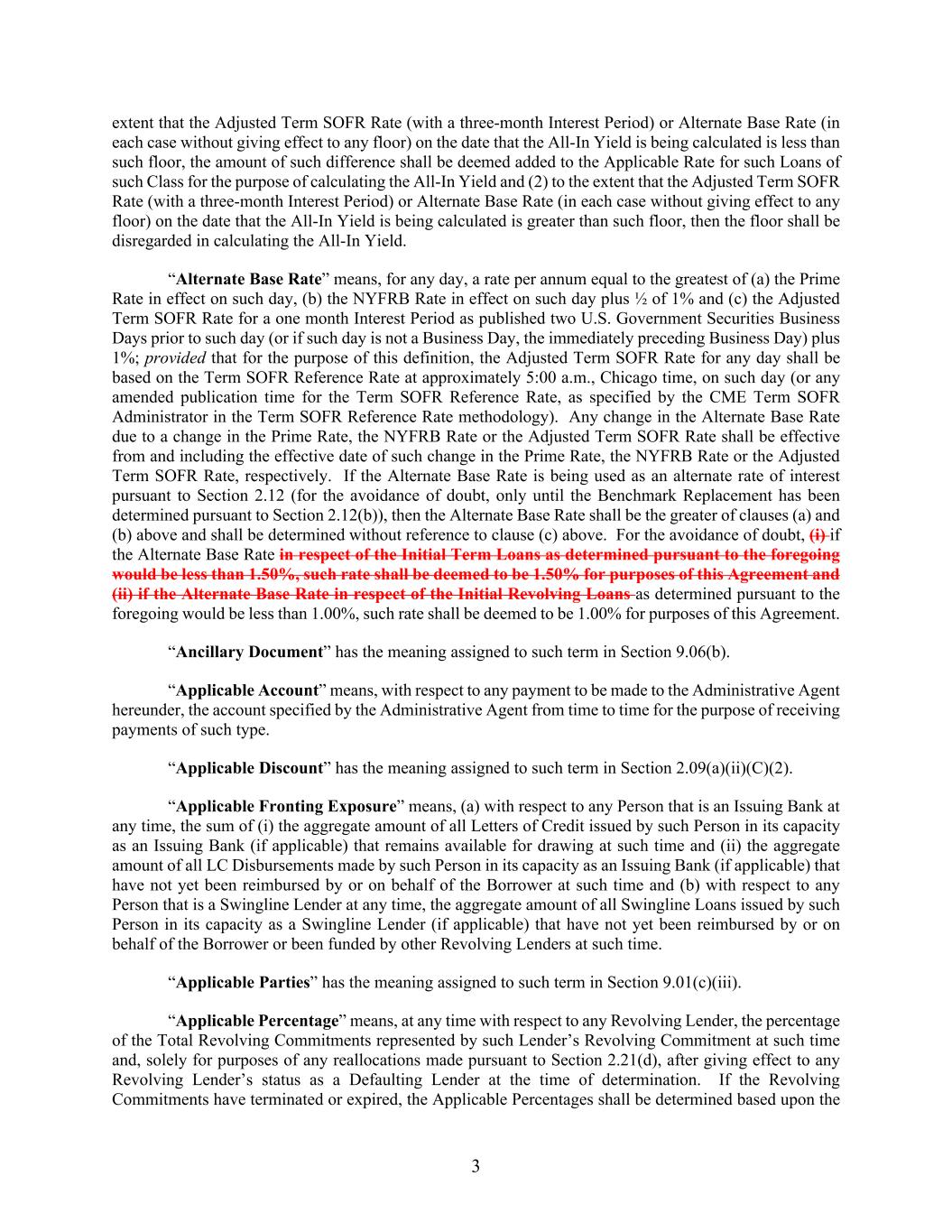 3 extent that the Adjusted Term SOFR Rate (with a three-month Interest Period) or Alternate Base Rate (in each case without giving effect to any floor) on the date that the All-In Yield is being calculated is less than such floor, the amount of such difference shall be deemed added to the Applicable Rate for such Loans of such Class for the purpose of calculating the All-In Yield and (2) to the extent that the Adjusted Term SOFR Rate (with a three-month Interest Period) or Alternate Base Rate (in each case without giving effect to any floor) on the date that the All-In Yield is being calculated is greater than such floor, then the floor shall be disregarded in calculating the All-In Yield. “Alternate Base Rate” means, for any day, a rate per annum equal to the greatest of (a) the Prime Rate in effect on such day, (b) the NYFRB Rate in effect on such day plus ½ of 1% and (c) the Adjusted Term SOFR Rate for a one month Interest Period as published two U.S. Government Securities Business Days prior to such day (or if such day is not a Business Day, the immediately preceding Business Day) plus 1%; provided that for the purpose of this definition, the Adjusted Term SOFR Rate for any day shall be based on the Term SOFR Reference Rate at approximately 5:00 a.m., Chicago time, on such day (or any amended publication time for the Term SOFR Reference Rate, as specified by the CME Term SOFR Administrator in the Term SOFR Reference Rate methodology). Any change in the Alternate Base Rate due to a change in the Prime Rate, the NYFRB Rate or the Adjusted Term SOFR Rate shall be effective from and including the effective date of such change in the Prime Rate, the NYFRB Rate or the Adjusted Term SOFR Rate, respectively. If the Alternate Base Rate is being used as an alternate rate of interest pursuant to Section 2.12 (for the avoidance of doubt, only until the Benchmark Replacement has been determined pursuant to Section 2.12(b)), then the Alternate Base Rate shall be the greater of clauses (a) and (b) above and shall be determined without reference to clause (c) above. For the avoidance of doubt, (i) if the Alternate Base Rate in respect of the Initial Term Loans as determined pursuant to the foregoing would be less than 1.50%, such rate shall be deemed to be 1.50% for purposes of this Agreement and (ii) if the Alternate Base Rate in respect of the Initial Revolving Loans as determined pursuant to the foregoing would be less than 1.00%, such rate shall be deemed to be 1.00% for purposes of this Agreement. “Ancillary Document” has the meaning assigned to such term in Section 9.06(b). “Applicable Account” means, with respect to any payment to be made to the Administrative Agent hereunder, the account specified by the Administrative Agent from time to time for the purpose of receiving payments of such type. “Applicable Discount” has the meaning assigned to such term in Section 2.09(a)(ii)(C)(2). “Applicable Fronting Exposure” means, (a) with respect to any Person that is an Issuing Bank at any time, the sum of (i) the aggregate amount of all Letters of Credit issued by such Person in its capacity as an Issuing Bank (if applicable) that remains available for drawing at such time and (ii) the aggregate amount of all LC Disbursements made by such Person in its capacity as an Issuing Bank (if applicable) that have not yet been reimbursed by or on behalf of the Borrower at such time and (b) with respect to any Person that is a Swingline Lender at any time, the aggregate amount of all Swingline Loans issued by such Person in its capacity as a Swingline Lender (if applicable) that have not yet been reimbursed by or on behalf of the Borrower or been funded by other Revolving Lenders at such time. “Applicable Parties” has the meaning assigned to such term in Section 9.01(c)(iii). “Applicable Percentage” means, at any time with respect to any Revolving Lender, the percentage of the Total Revolving Commitments represented by such Lender’s Revolving Commitment at such time and, solely for purposes of any reallocations made pursuant to Section 2.21(d), after giving effect to any Revolving Lender’s status as a Defaulting Lender at the time of determination. If the Revolving Commitments have terminated or expired, the Applicable Percentages shall be determined based upon the