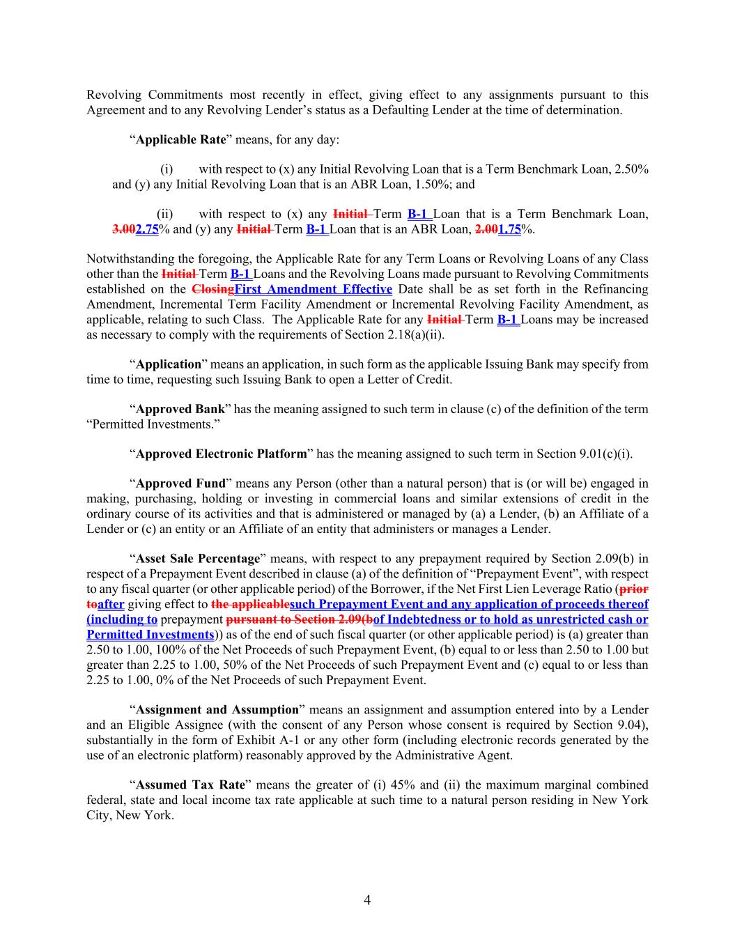 4 Revolving Commitments most recently in effect, giving effect to any assignments pursuant to this Agreement and to any Revolving Lender’s status as a Defaulting Lender at the time of determination. “Applicable Rate” means, for any day: (i) with respect to (x) any Initial Revolving Loan that is a Term Benchmark Loan, 2.50% and (y) any Initial Revolving Loan that is an ABR Loan, 1.50%; and (ii) with respect to (x) any Initial Term B-1 Loan that is a Term Benchmark Loan, 3.002.75% and (y) any Initial Term B-1 Loan that is an ABR Loan, 2.001.75%. Notwithstanding the foregoing, the Applicable Rate for any Term Loans or Revolving Loans of any Class other than the Initial Term B-1 Loans and the Revolving Loans made pursuant to Revolving Commitments established on the ClosingFirst Amendment Effective Date shall be as set forth in the Refinancing Amendment, Incremental Term Facility Amendment or Incremental Revolving Facility Amendment, as applicable, relating to such Class. The Applicable Rate for any Initial Term B-1 Loans may be increased as necessary to comply with the requirements of Section 2.18(a)(ii). “Application” means an application, in such form as the applicable Issuing Bank may specify from time to time, requesting such Issuing Bank to open a Letter of Credit. “Approved Bank” has the meaning assigned to such term in clause (c) of the definition of the term “Permitted Investments.” “Approved Electronic Platform” has the meaning assigned to such term in Section 9.01(c)(i). “Approved Fund” means any Person (other than a natural person) that is (or will be) engaged in making, purchasing, holding or investing in commercial loans and similar extensions of credit in the ordinary course of its activities and that is administered or managed by (a) a Lender, (b) an Affiliate of a Lender or (c) an entity or an Affiliate of an entity that administers or manages a Lender. “Asset Sale Percentage” means, with respect to any prepayment required by Section 2.09(b) in respect of a Prepayment Event described in clause (a) of the definition of “Prepayment Event”, with respect to any fiscal quarter (or other applicable period) of the Borrower, if the Net First Lien Leverage Ratio (prior toafter giving effect to the applicablesuch Prepayment Event and any application of proceeds thereof (including to prepayment pursuant to Section 2.09(bof Indebtedness or to hold as unrestricted cash or Permitted Investments)) as of the end of such fiscal quarter (or other applicable period) is (a) greater than 2.50 to 1.00, 100% of the Net Proceeds of such Prepayment Event, (b) equal to or less than 2.50 to 1.00 but greater than 2.25 to 1.00, 50% of the Net Proceeds of such Prepayment Event and (c) equal to or less than 2.25 to 1.00, 0% of the Net Proceeds of such Prepayment Event. “Assignment and Assumption” means an assignment and assumption entered into by a Lender and an Eligible Assignee (with the consent of any Person whose consent is required by Section 9.04), substantially in the form of Exhibit A-1 or any other form (including electronic records generated by the use of an electronic platform) reasonably approved by the Administrative Agent. “Assumed Tax Rate” means the greater of (i) 45% and (ii) the maximum marginal combined federal, state and local income tax rate applicable at such time to a natural person residing in New York City, New York.