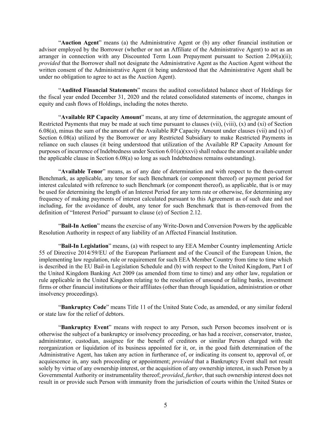 5 “Auction Agent” means (a) the Administrative Agent or (b) any other financial institution or advisor employed by the Borrower (whether or not an Affiliate of the Administrative Agent) to act as an arranger in connection with any Discounted Term Loan Prepayment pursuant to Section 2.09(a)(ii); provided that the Borrower shall not designate the Administrative Agent as the Auction Agent without the written consent of the Administrative Agent (it being understood that the Administrative Agent shall be under no obligation to agree to act as the Auction Agent). “Audited Financial Statements” means the audited consolidated balance sheet of Holdings for the fiscal year ended December 31, 2020 and the related consolidated statements of income, changes in equity and cash flows of Holdings, including the notes thereto. “Available RP Capacity Amount” means, at any time of determination, the aggregate amount of Restricted Payments that may be made at such time pursuant to clauses (vii), (viii), (x) and (xi) of Section 6.08(a), minus the sum of the amount of the Available RP Capacity Amount under clauses (vii) and (x) of Section 6.08(a) utilized by the Borrower or any Restricted Subsidiary to make Restricted Payments in reliance on such clauses (it being understood that utilization of the Available RP Capacity Amount for purposes of incurrence of Indebtedness under Section 6.01(a)(xxvi) shall reduce the amount available under the applicable clause in Section 6.08(a) so long as such Indebtedness remains outstanding). “Available Tenor” means, as of any date of determination and with respect to the then-current Benchmark, as applicable, any tenor for such Benchmark (or component thereof) or payment period for interest calculated with reference to such Benchmark (or component thereof), as applicable, that is or may be used for determining the length of an Interest Period for any term rate or otherwise, for determining any frequency of making payments of interest calculated pursuant to this Agreement as of such date and not including, for the avoidance of doubt, any tenor for such Benchmark that is then-removed from the definition of “Interest Period” pursuant to clause (e) of Section 2.12. “Bail-In Action” means the exercise of any Write-Down and Conversion Powers by the applicable Resolution Authority in respect of any liability of an Affected Financial Institution. “Bail-In Legislation” means, (a) with respect to any EEA Member Country implementing Article 55 of Directive 2014/59/EU of the European Parliament and of the Council of the European Union, the implementing law regulation, rule or requirement for such EEA Member Country from time to time which is described in the EU Bail-in Legislation Schedule and (b) with respect to the United Kingdom, Part I of the United Kingdom Banking Act 2009 (as amended from time to time) and any other law, regulation or rule applicable in the United Kingdom relating to the resolution of unsound or failing banks, investment firms or other financial institutions or their affiliates (other than through liquidation, administration or other insolvency proceedings). “Bankruptcy Code” means Title 11 of the United State Code, as amended, or any similar federal or state law for the relief of debtors. “Bankruptcy Event” means with respect to any Person, such Person becomes insolvent or is otherwise the subject of a bankruptcy or insolvency proceeding, or has had a receiver, conservator, trustee, administrator, custodian, assignee for the benefit of creditors or similar Person charged with the reorganization or liquidation of its business appointed for it, or, in the good faith determination of the Administrative Agent, has taken any action in furtherance of, or indicating its consent to, approval of, or acquiescence in, any such proceeding or appointment; provided that a Bankruptcy Event shall not result solely by virtue of any ownership interest, or the acquisition of any ownership interest, in such Person by a Governmental Authority or instrumentality thereof; provided, further, that such ownership interest does not result in or provide such Person with immunity from the jurisdiction of courts within the United States or