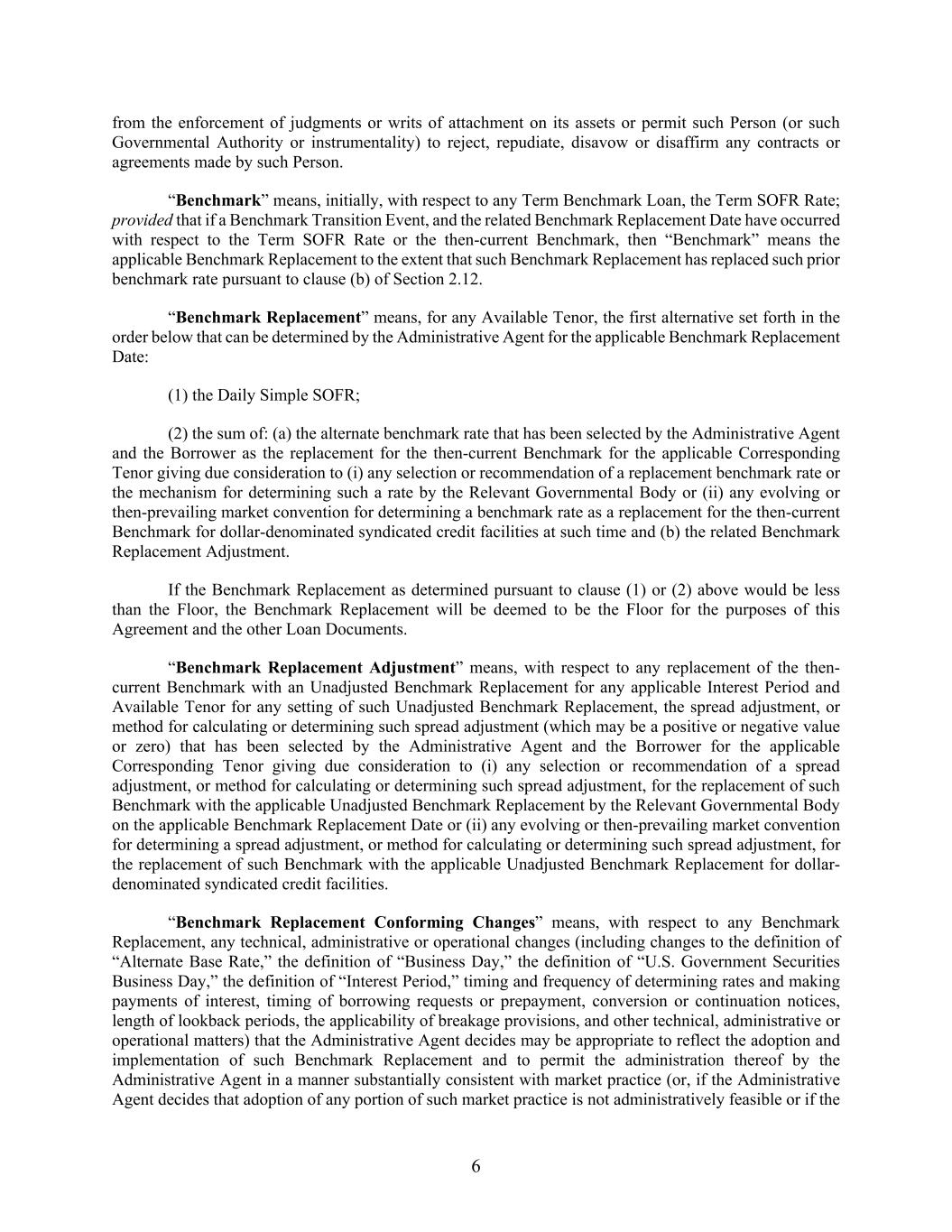 6 from the enforcement of judgments or writs of attachment on its assets or permit such Person (or such Governmental Authority or instrumentality) to reject, repudiate, disavow or disaffirm any contracts or agreements made by such Person. “Benchmark” means, initially, with respect to any Term Benchmark Loan, the Term SOFR Rate; provided that if a Benchmark Transition Event, and the related Benchmark Replacement Date have occurred with respect to the Term SOFR Rate or the then-current Benchmark, then “Benchmark” means the applicable Benchmark Replacement to the extent that such Benchmark Replacement has replaced such prior benchmark rate pursuant to clause (b) of Section 2.12. “Benchmark Replacement” means, for any Available Tenor, the first alternative set forth in the order below that can be determined by the Administrative Agent for the applicable Benchmark Replacement Date: (1) the Daily Simple SOFR; (2) the sum of: (a) the alternate benchmark rate that has been selected by the Administrative Agent and the Borrower as the replacement for the then-current Benchmark for the applicable Corresponding Tenor giving due consideration to (i) any selection or recommendation of a replacement benchmark rate or the mechanism for determining such a rate by the Relevant Governmental Body or (ii) any evolving or then-prevailing market convention for determining a benchmark rate as a replacement for the then-current Benchmark for dollar-denominated syndicated credit facilities at such time and (b) the related Benchmark Replacement Adjustment. If the Benchmark Replacement as determined pursuant to clause (1) or (2) above would be less than the Floor, the Benchmark Replacement will be deemed to be the Floor for the purposes of this Agreement and the other Loan Documents. “Benchmark Replacement Adjustment” means, with respect to any replacement of the then- current Benchmark with an Unadjusted Benchmark Replacement for any applicable Interest Period and Available Tenor for any setting of such Unadjusted Benchmark Replacement, the spread adjustment, or method for calculating or determining such spread adjustment (which may be a positive or negative value or zero) that has been selected by the Administrative Agent and the Borrower for the applicable Corresponding Tenor giving due consideration to (i) any selection or recommendation of a spread adjustment, or method for calculating or determining such spread adjustment, for the replacement of such Benchmark with the applicable Unadjusted Benchmark Replacement by the Relevant Governmental Body on the applicable Benchmark Replacement Date or (ii) any evolving or then-prevailing market convention for determining a spread adjustment, or method for calculating or determining such spread adjustment, for the replacement of such Benchmark with the applicable Unadjusted Benchmark Replacement for dollar- denominated syndicated credit facilities. “Benchmark Replacement Conforming Changes” means, with respect to any Benchmark Replacement, any technical, administrative or operational changes (including changes to the definition of “Alternate Base Rate,” the definition of “Business Day,” the definition of “U.S. Government Securities Business Day,” the definition of “Interest Period,” timing and frequency of determining rates and making payments of interest, timing of borrowing requests or prepayment, conversion or continuation notices, length of lookback periods, the applicability of breakage provisions, and other technical, administrative or operational matters) that the Administrative Agent decides may be appropriate to reflect the adoption and implementation of such Benchmark Replacement and to permit the administration thereof by the Administrative Agent in a manner substantially consistent with market practice (or, if the Administrative Agent decides that adoption of any portion of such market practice is not administratively feasible or if the
