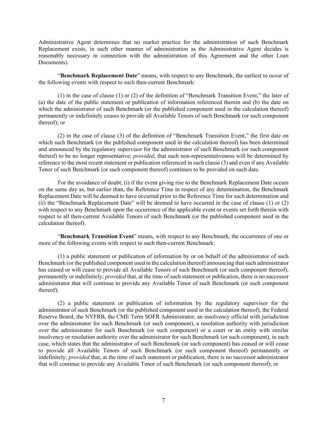 7 Administrative Agent determines that no market practice for the administration of such Benchmark Replacement exists, in such other manner of administration as the Administrative Agent decides is reasonably necessary in connection with the administration of this Agreement and the other Loan Documents). “Benchmark Replacement Date” means, with respect to any Benchmark, the earliest to occur of the following events with respect to such then-current Benchmark: (1) in the case of clause (1) or (2) of the definition of “Benchmark Transition Event,” the later of (a) the date of the public statement or publication of information referenced therein and (b) the date on which the administrator of such Benchmark (or the published component used in the calculation thereof) permanently or indefinitely ceases to provide all Available Tenors of such Benchmark (or such component thereof); or (2) in the case of clause (3) of the definition of “Benchmark Transition Event,” the first date on which such Benchmark (or the published component used in the calculation thereof) has been determined and announced by the regulatory supervisor for the administrator of such Benchmark (or such component thereof) to be no longer representative; provided, that such non-representativeness will be determined by reference to the most recent statement or publication referenced in such clause (3) and even if any Available Tenor of such Benchmark (or such component thereof) continues to be provided on such date. For the avoidance of doubt, (i) if the event giving rise to the Benchmark Replacement Date occurs on the same day as, but earlier than, the Reference Time in respect of any determination, the Benchmark Replacement Date will be deemed to have occurred prior to the Reference Time for such determination and (ii) the “Benchmark Replacement Date” will be deemed to have occurred in the case of clause (1) or (2) with respect to any Benchmark upon the occurrence of the applicable event or events set forth therein with respect to all then-current Available Tenors of such Benchmark (or the published component used in the calculation thereof). “Benchmark Transition Event” means, with respect to any Benchmark, the occurrence of one or more of the following events with respect to such then-current Benchmark: (1) a public statement or publication of information by or on behalf of the administrator of such Benchmark (or the published component used in the calculation thereof) announcing that such administrator has ceased or will cease to provide all Available Tenors of such Benchmark (or such component thereof), permanently or indefinitely; provided that, at the time of such statement or publication, there is no successor administrator that will continue to provide any Available Tenor of such Benchmark (or such component thereof); (2) a public statement or publication of information by the regulatory supervisor for the administrator of such Benchmark (or the published component used in the calculation thereof), the Federal Reserve Board, the NYFRB, the CME Term SOFR Administrator, an insolvency official with jurisdiction over the administrator for such Benchmark (or such component), a resolution authority with jurisdiction over the administrator for such Benchmark (or such component) or a court or an entity with similar insolvency or resolution authority over the administrator for such Benchmark (or such component), in each case, which states that the administrator of such Benchmark (or such component) has ceased or will cease to provide all Available Tenors of such Benchmark (or such component thereof) permanently or indefinitely; provided that, at the time of such statement or publication, there is no successor administrator that will continue to provide any Available Tenor of such Benchmark (or such component thereof); or