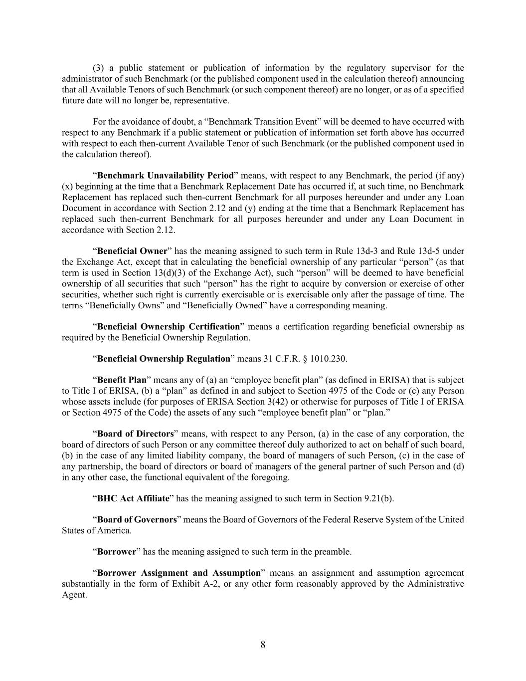 8 (3) a public statement or publication of information by the regulatory supervisor for the administrator of such Benchmark (or the published component used in the calculation thereof) announcing that all Available Tenors of such Benchmark (or such component thereof) are no longer, or as of a specified future date will no longer be, representative. For the avoidance of doubt, a “Benchmark Transition Event” will be deemed to have occurred with respect to any Benchmark if a public statement or publication of information set forth above has occurred with respect to each then-current Available Tenor of such Benchmark (or the published component used in the calculation thereof). “Benchmark Unavailability Period” means, with respect to any Benchmark, the period (if any) (x) beginning at the time that a Benchmark Replacement Date has occurred if, at such time, no Benchmark Replacement has replaced such then-current Benchmark for all purposes hereunder and under any Loan Document in accordance with Section 2.12 and (y) ending at the time that a Benchmark Replacement has replaced such then-current Benchmark for all purposes hereunder and under any Loan Document in accordance with Section 2.12. “Beneficial Owner” has the meaning assigned to such term in Rule 13d-3 and Rule 13d-5 under the Exchange Act, except that in calculating the beneficial ownership of any particular “person” (as that term is used in Section 13(d)(3) of the Exchange Act), such “person” will be deemed to have beneficial ownership of all securities that such “person” has the right to acquire by conversion or exercise of other securities, whether such right is currently exercisable or is exercisable only after the passage of time. The terms “Beneficially Owns” and “Beneficially Owned” have a corresponding meaning. “Beneficial Ownership Certification” means a certification regarding beneficial ownership as required by the Beneficial Ownership Regulation. “Beneficial Ownership Regulation” means 31 C.F.R. § 1010.230. “Benefit Plan” means any of (a) an “employee benefit plan” (as defined in ERISA) that is subject to Title I of ERISA, (b) a “plan” as defined in and subject to Section 4975 of the Code or (c) any Person whose assets include (for purposes of ERISA Section 3(42) or otherwise for purposes of Title I of ERISA or Section 4975 of the Code) the assets of any such “employee benefit plan” or “plan.” “Board of Directors” means, with respect to any Person, (a) in the case of any corporation, the board of directors of such Person or any committee thereof duly authorized to act on behalf of such board, (b) in the case of any limited liability company, the board of managers of such Person, (c) in the case of any partnership, the board of directors or board of managers of the general partner of such Person and (d) in any other case, the functional equivalent of the foregoing. “BHC Act Affiliate” has the meaning assigned to such term in Section 9.21(b). “Board of Governors” means the Board of Governors of the Federal Reserve System of the United States of America. “Borrower” has the meaning assigned to such term in the preamble. “Borrower Assignment and Assumption” means an assignment and assumption agreement substantially in the form of Exhibit A-2, or any other form reasonably approved by the Administrative Agent.