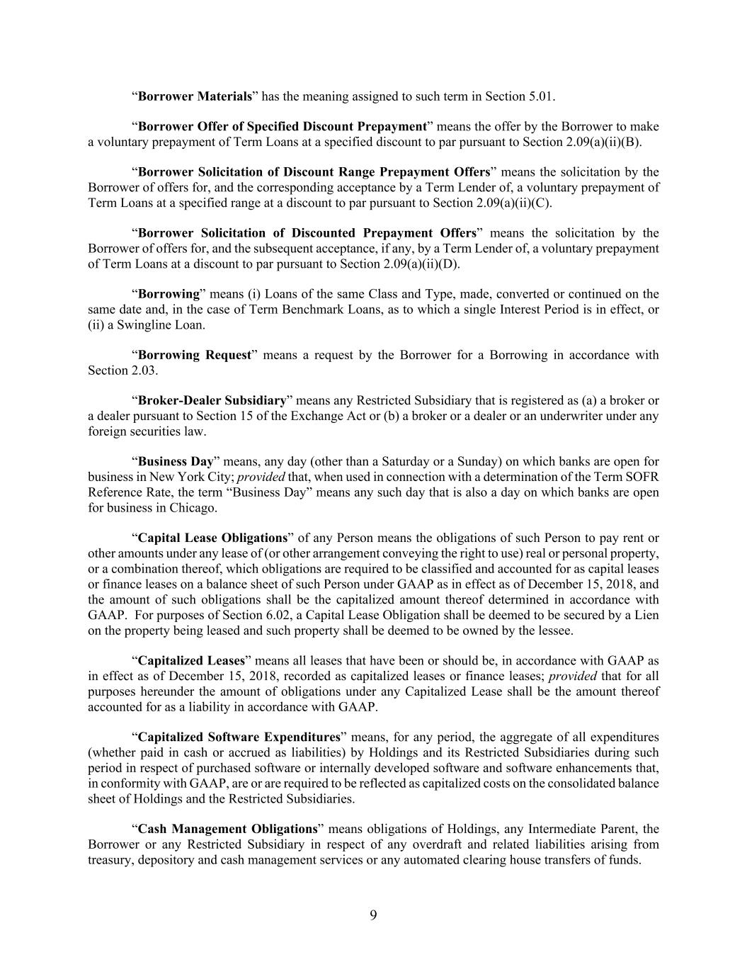9 “Borrower Materials” has the meaning assigned to such term in Section 5.01. “Borrower Offer of Specified Discount Prepayment” means the offer by the Borrower to make a voluntary prepayment of Term Loans at a specified discount to par pursuant to Section 2.09(a)(ii)(B). “Borrower Solicitation of Discount Range Prepayment Offers” means the solicitation by the Borrower of offers for, and the corresponding acceptance by a Term Lender of, a voluntary prepayment of Term Loans at a specified range at a discount to par pursuant to Section 2.09(a)(ii)(C). “Borrower Solicitation of Discounted Prepayment Offers” means the solicitation by the Borrower of offers for, and the subsequent acceptance, if any, by a Term Lender of, a voluntary prepayment of Term Loans at a discount to par pursuant to Section 2.09(a)(ii)(D). “Borrowing” means (i) Loans of the same Class and Type, made, converted or continued on the same date and, in the case of Term Benchmark Loans, as to which a single Interest Period is in effect, or (ii) a Swingline Loan. “Borrowing Request” means a request by the Borrower for a Borrowing in accordance with Section 2.03. “Broker-Dealer Subsidiary” means any Restricted Subsidiary that is registered as (a) a broker or a dealer pursuant to Section 15 of the Exchange Act or (b) a broker or a dealer or an underwriter under any foreign securities law. “Business Day” means, any day (other than a Saturday or a Sunday) on which banks are open for business in New York City; provided that, when used in connection with a determination of the Term SOFR Reference Rate, the term “Business Day” means any such day that is also a day on which banks are open for business in Chicago. “Capital Lease Obligations” of any Person means the obligations of such Person to pay rent or other amounts under any lease of (or other arrangement conveying the right to use) real or personal property, or a combination thereof, which obligations are required to be classified and accounted for as capital leases or finance leases on a balance sheet of such Person under GAAP as in effect as of December 15, 2018, and the amount of such obligations shall be the capitalized amount thereof determined in accordance with GAAP. For purposes of Section 6.02, a Capital Lease Obligation shall be deemed to be secured by a Lien on the property being leased and such property shall be deemed to be owned by the lessee. “Capitalized Leases” means all leases that have been or should be, in accordance with GAAP as in effect as of December 15, 2018, recorded as capitalized leases or finance leases; provided that for all purposes hereunder the amount of obligations under any Capitalized Lease shall be the amount thereof accounted for as a liability in accordance with GAAP. “Capitalized Software Expenditures” means, for any period, the aggregate of all expenditures (whether paid in cash or accrued as liabilities) by Holdings and its Restricted Subsidiaries during such period in respect of purchased software or internally developed software and software enhancements that, in conformity with GAAP, are or are required to be reflected as capitalized costs on the consolidated balance sheet of Holdings and the Restricted Subsidiaries. “Cash Management Obligations” means obligations of Holdings, any Intermediate Parent, the Borrower or any Restricted Subsidiary in respect of any overdraft and related liabilities arising from treasury, depository and cash management services or any automated clearing house transfers of funds.