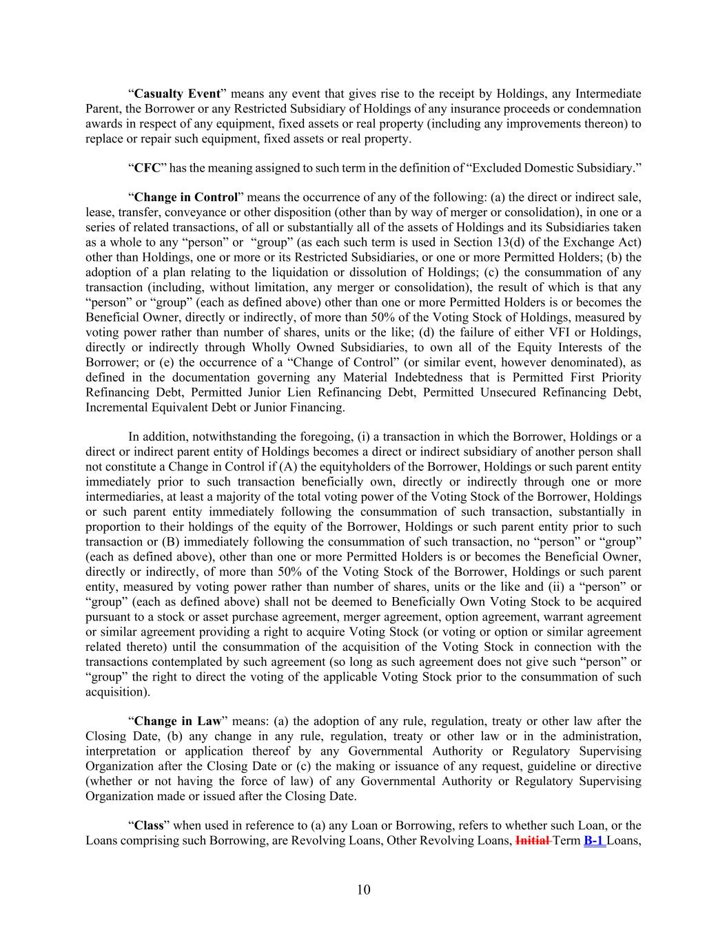 10 “Casualty Event” means any event that gives rise to the receipt by Holdings, any Intermediate Parent, the Borrower or any Restricted Subsidiary of Holdings of any insurance proceeds or condemnation awards in respect of any equipment, fixed assets or real property (including any improvements thereon) to replace or repair such equipment, fixed assets or real property. “CFC” has the meaning assigned to such term in the definition of “Excluded Domestic Subsidiary.” “Change in Control” means the occurrence of any of the following: (a) the direct or indirect sale, lease, transfer, conveyance or other disposition (other than by way of merger or consolidation), in one or a series of related transactions, of all or substantially all of the assets of Holdings and its Subsidiaries taken as a whole to any “person” or “group” (as each such term is used in Section 13(d) of the Exchange Act) other than Holdings, one or more or its Restricted Subsidiaries, or one or more Permitted Holders; (b) the adoption of a plan relating to the liquidation or dissolution of Holdings; (c) the consummation of any transaction (including, without limitation, any merger or consolidation), the result of which is that any “person” or “group” (each as defined above) other than one or more Permitted Holders is or becomes the Beneficial Owner, directly or indirectly, of more than 50% of the Voting Stock of Holdings, measured by voting power rather than number of shares, units or the like; (d) the failure of either VFI or Holdings, directly or indirectly through Wholly Owned Subsidiaries, to own all of the Equity Interests of the Borrower; or (e) the occurrence of a “Change of Control” (or similar event, however denominated), as defined in the documentation governing any Material Indebtedness that is Permitted First Priority Refinancing Debt, Permitted Junior Lien Refinancing Debt, Permitted Unsecured Refinancing Debt, Incremental Equivalent Debt or Junior Financing. In addition, notwithstanding the foregoing, (i) a transaction in which the Borrower, Holdings or a direct or indirect parent entity of Holdings becomes a direct or indirect subsidiary of another person shall not constitute a Change in Control if (A) the equityholders of the Borrower, Holdings or such parent entity immediately prior to such transaction beneficially own, directly or indirectly through one or more intermediaries, at least a majority of the total voting power of the Voting Stock of the Borrower, Holdings or such parent entity immediately following the consummation of such transaction, substantially in proportion to their holdings of the equity of the Borrower, Holdings or such parent entity prior to such transaction or (B) immediately following the consummation of such transaction, no “person” or “group” (each as defined above), other than one or more Permitted Holders is or becomes the Beneficial Owner, directly or indirectly, of more than 50% of the Voting Stock of the Borrower, Holdings or such parent entity, measured by voting power rather than number of shares, units or the like and (ii) a “person” or “group” (each as defined above) shall not be deemed to Beneficially Own Voting Stock to be acquired pursuant to a stock or asset purchase agreement, merger agreement, option agreement, warrant agreement or similar agreement providing a right to acquire Voting Stock (or voting or option or similar agreement related thereto) until the consummation of the acquisition of the Voting Stock in connection with the transactions contemplated by such agreement (so long as such agreement does not give such “person” or “group” the right to direct the voting of the applicable Voting Stock prior to the consummation of such acquisition). “Change in Law” means: (a) the adoption of any rule, regulation, treaty or other law after the Closing Date, (b) any change in any rule, regulation, treaty or other law or in the administration, interpretation or application thereof by any Governmental Authority or Regulatory Supervising Organization after the Closing Date or (c) the making or issuance of any request, guideline or directive (whether or not having the force of law) of any Governmental Authority or Regulatory Supervising Organization made or issued after the Closing Date. “Class” when used in reference to (a) any Loan or Borrowing, refers to whether such Loan, or the Loans comprising such Borrowing, are Revolving Loans, Other Revolving Loans, Initial Term B-1 Loans,