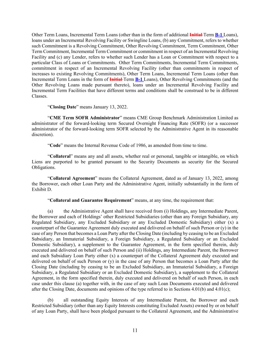 11 Other Term Loans, Incremental Term Loans (other than in the form of additional Initial Term B-1 Loans), loans under an Incremental Revolving Facility or Swingline Loans, (b) any Commitment, refers to whether such Commitment is a Revolving Commitment, Other Revolving Commitment, Term Commitment, Other Term Commitment, Incremental Term Commitment or commitment in respect of an Incremental Revolving Facility and (c) any Lender, refers to whether such Lender has a Loan or Commitment with respect to a particular Class of Loans or Commitments. Other Term Commitments, Incremental Term Commitments, commitment in respect of an Incremental Revolving Facility (other than commitments in respect of increases to existing Revolving Commitments), Other Term Loans, Incremental Term Loans (other than Incremental Term Loans in the form of Initial Term B-1 Loans), Other Revolving Commitments (and the Other Revolving Loans made pursuant thereto), loans under an Incremental Revolving Facility and Incremental Term Facilities that have different terms and conditions shall be construed to be in different Classes. “Closing Date” means January 13, 2022. “CME Term SOFR Administrator” means CME Group Benchmark Administration Limited as administrator of the forward-looking term Secured Overnight Financing Rate (SOFR) (or a successor administrator of the forward-looking term SOFR selected by the Administrative Agent in its reasonable discretion). “Code” means the Internal Revenue Code of 1986, as amended from time to time. “Collateral” means any and all assets, whether real or personal, tangible or intangible, on which Liens are purported to be granted pursuant to the Security Documents as security for the Secured Obligations. “Collateral Agreement” means the Collateral Agreement, dated as of January 13, 2022, among the Borrower, each other Loan Party and the Administrative Agent, initially substantially in the form of Exhibit D. “Collateral and Guarantee Requirement” means, at any time, the requirement that: (a) the Administrative Agent shall have received from (i) Holdings, any Intermediate Parent, the Borrower and each of Holdings’ other Restricted Subsidiaries (other than any Foreign Subsidiary, any Regulated Subsidiary, any Excluded Subsidiary or any Excluded Domestic Subsidiary) either (x) a counterpart of the Guarantee Agreement duly executed and delivered on behalf of such Person or (y) in the case of any Person that becomes a Loan Party after the Closing Date (including by ceasing to be an Excluded Subsidiary, an Immaterial Subsidiary, a Foreign Subsidiary, a Regulated Subsidiary or an Excluded Domestic Subsidiary), a supplement to the Guarantee Agreement, in the form specified therein, duly executed and delivered on behalf of such Person and (ii) Holdings, any Intermediate Parent, the Borrower and each Subsidiary Loan Party either (x) a counterpart of the Collateral Agreement duly executed and delivered on behalf of such Person or (y) in the case of any Person that becomes a Loan Party after the Closing Date (including by ceasing to be an Excluded Subsidiary, an Immaterial Subsidiary, a Foreign Subsidiary, a Regulated Subsidiary or an Excluded Domestic Subsidiary), a supplement to the Collateral Agreement, in the form specified therein, duly executed and delivered on behalf of such Person, in each case under this clause (a) together with, in the case of any such Loan Documents executed and delivered after the Closing Date, documents and opinions of the type referred to in Sections 4.01(b) and 4.01(c); (b) all outstanding Equity Interests of any Intermediate Parent, the Borrower and each Restricted Subsidiary (other than any Equity Interests constituting Excluded Assets) owned by or on behalf of any Loan Party, shall have been pledged pursuant to the Collateral Agreement, and the Administrative
