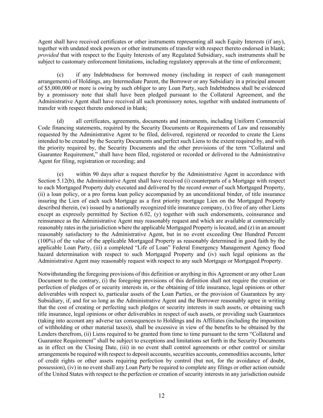 12 Agent shall have received certificates or other instruments representing all such Equity Interests (if any), together with undated stock powers or other instruments of transfer with respect thereto endorsed in blank; provided that with respect to the Equity Interests of any Regulated Subsidiary, such instruments shall be subject to customary enforcement limitations, including regulatory approvals at the time of enforcement; (c) if any Indebtedness for borrowed money (including in respect of cash management arrangements) of Holdings, any Intermediate Parent, the Borrower or any Subsidiary in a principal amount of $5,000,000 or more is owing by such obligor to any Loan Party, such Indebtedness shall be evidenced by a promissory note that shall have been pledged pursuant to the Collateral Agreement, and the Administrative Agent shall have received all such promissory notes, together with undated instruments of transfer with respect thereto endorsed in blank; (d) all certificates, agreements, documents and instruments, including Uniform Commercial Code financing statements, required by the Security Documents or Requirements of Law and reasonably requested by the Administrative Agent to be filed, delivered, registered or recorded to create the Liens intended to be created by the Security Documents and perfect such Liens to the extent required by, and with the priority required by, the Security Documents and the other provisions of the term “Collateral and Guarantee Requirement,” shall have been filed, registered or recorded or delivered to the Administrative Agent for filing, registration or recording; and (e) within 90 days after a request therefor by the Administrative Agent in accordance with Section 5.12(b), the Administrative Agent shall have received (i) counterparts of a Mortgage with respect to each Mortgaged Property duly executed and delivered by the record owner of such Mortgaged Property, (ii) a loan policy, or a pro forma loan policy accompanied by an unconditional binder, of title insurance insuring the Lien of each such Mortgage as a first priority mortgage Lien on the Mortgaged Property described therein, (w) issued by a nationally recognized title insurance company, (x) free of any other Liens except as expressly permitted by Section 6.02, (y) together with such endorsements, coinsurance and reinsurance as the Administrative Agent may reasonably request and which are available at commercially reasonably rates in the jurisdiction where the applicable Mortgaged Property is located, and (z) in an amount reasonably satisfactory to the Administrative Agent, but in no event exceeding One Hundred Percent (100%) of the value of the applicable Mortgaged Property as reasonably determined in good faith by the applicable Loan Party, (iii) a completed “Life of Loan” Federal Emergency Management Agency flood hazard determination with respect to such Mortgaged Property and (iv) such legal opinions as the Administrative Agent may reasonably request with respect to any such Mortgage or Mortgaged Property. Notwithstanding the foregoing provisions of this definition or anything in this Agreement or any other Loan Document to the contrary, (i) the foregoing provisions of this definition shall not require the creation or perfection of pledges of or security interests in, or the obtaining of title insurance, legal opinions or other deliverables with respect to, particular assets of the Loan Parties, or the provision of Guarantees by any Subsidiary, if, and for so long as the Administrative Agent and the Borrower reasonably agree in writing that the cost of creating or perfecting such pledges or security interests in such assets, or obtaining such title insurance, legal opinions or other deliverables in respect of such assets, or providing such Guarantees (taking into account any adverse tax consequences to Holdings and its Affiliates (including the imposition of withholding or other material taxes)), shall be excessive in view of the benefits to be obtained by the Lenders therefrom, (ii) Liens required to be granted from time to time pursuant to the term “Collateral and Guarantee Requirement” shall be subject to exceptions and limitations set forth in the Security Documents as in effect on the Closing Date, (iii) in no event shall control agreements or other control or similar arrangements be required with respect to deposit accounts, securities accounts, commodities accounts, letter of credit rights or other assets requiring perfection by control (but not, for the avoidance of doubt, possession), (iv) in no event shall any Loan Party be required to complete any filings or other action outside of the United States with respect to the perfection or creation of security interests in any jurisdiction outside