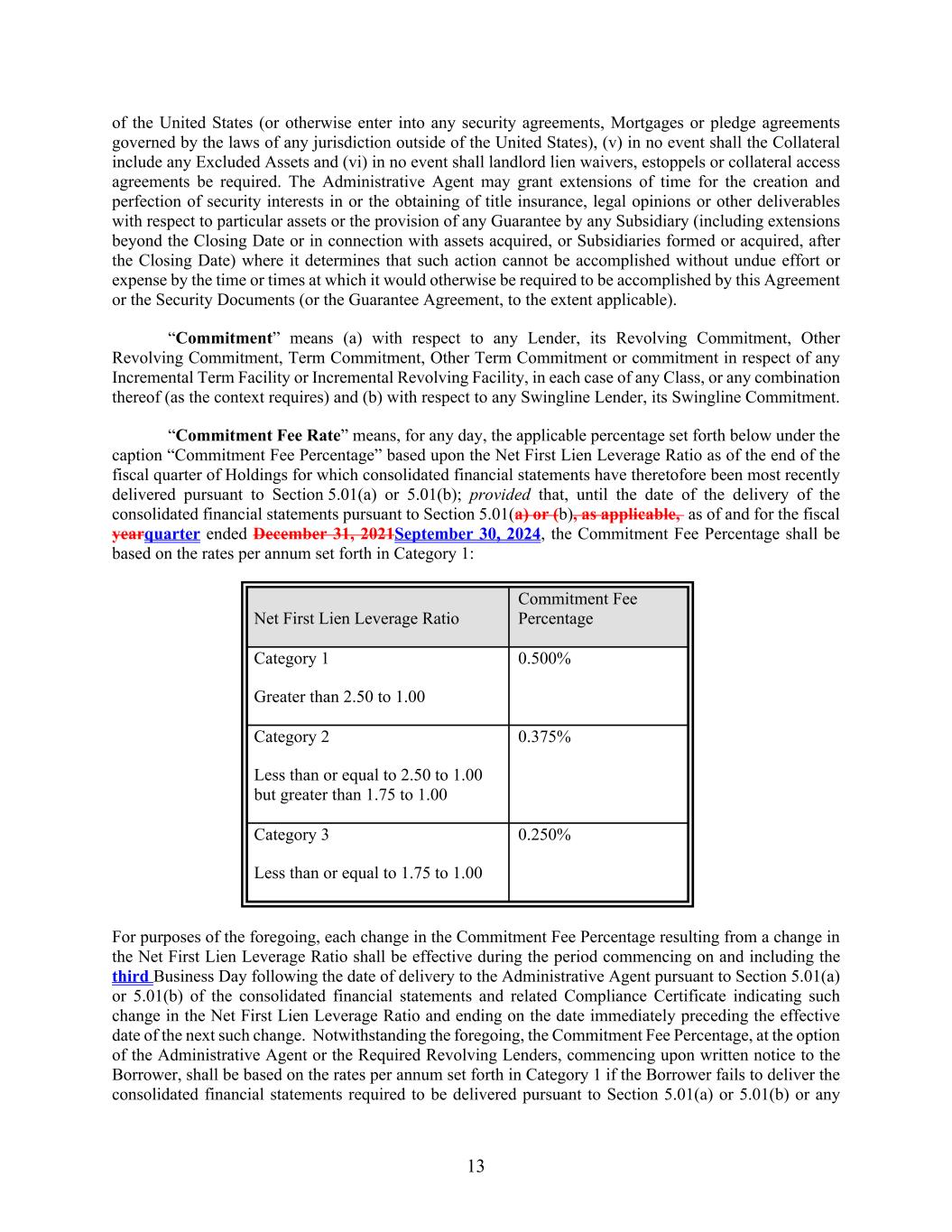 13 of the United States (or otherwise enter into any security agreements, Mortgages or pledge agreements governed by the laws of any jurisdiction outside of the United States), (v) in no event shall the Collateral include any Excluded Assets and (vi) in no event shall landlord lien waivers, estoppels or collateral access agreements be required. The Administrative Agent may grant extensions of time for the creation and perfection of security interests in or the obtaining of title insurance, legal opinions or other deliverables with respect to particular assets or the provision of any Guarantee by any Subsidiary (including extensions beyond the Closing Date or in connection with assets acquired, or Subsidiaries formed or acquired, after the Closing Date) where it determines that such action cannot be accomplished without undue effort or expense by the time or times at which it would otherwise be required to be accomplished by this Agreement or the Security Documents (or the Guarantee Agreement, to the extent applicable). “Commitment” means (a) with respect to any Lender, its Revolving Commitment, Other Revolving Commitment, Term Commitment, Other Term Commitment or commitment in respect of any Incremental Term Facility or Incremental Revolving Facility, in each case of any Class, or any combination thereof (as the context requires) and (b) with respect to any Swingline Lender, its Swingline Commitment. “Commitment Fee Rate” means, for any day, the applicable percentage set forth below under the caption “Commitment Fee Percentage” based upon the Net First Lien Leverage Ratio as of the end of the fiscal quarter of Holdings for which consolidated financial statements have theretofore been most recently delivered pursuant to Section 5.01(a) or 5.01(b); provided that, until the date of the delivery of the consolidated financial statements pursuant to Section 5.01(a) or (b), as applicable, as of and for the fiscal yearquarter ended December 31, 2021September 30, 2024, the Commitment Fee Percentage shall be based on the rates per annum set forth in Category 1: Net First Lien Leverage Ratio Commitment Fee Percentage Category 1 Greater than 2.50 to 1.00 0.500% Category 2 Less than or equal to 2.50 to 1.00 but greater than 1.75 to 1.00 0.375% Category 3 Less than or equal to 1.75 to 1.00 0.250% For purposes of the foregoing, each change in the Commitment Fee Percentage resulting from a change in the Net First Lien Leverage Ratio shall be effective during the period commencing on and including the third Business Day following the date of delivery to the Administrative Agent pursuant to Section 5.01(a) or 5.01(b) of the consolidated financial statements and related Compliance Certificate indicating such change in the Net First Lien Leverage Ratio and ending on the date immediately preceding the effective date of the next such change. Notwithstanding the foregoing, the Commitment Fee Percentage, at the option of the Administrative Agent or the Required Revolving Lenders, commencing upon written notice to the Borrower, shall be based on the rates per annum set forth in Category 1 if the Borrower fails to deliver the consolidated financial statements required to be delivered pursuant to Section 5.01(a) or 5.01(b) or any