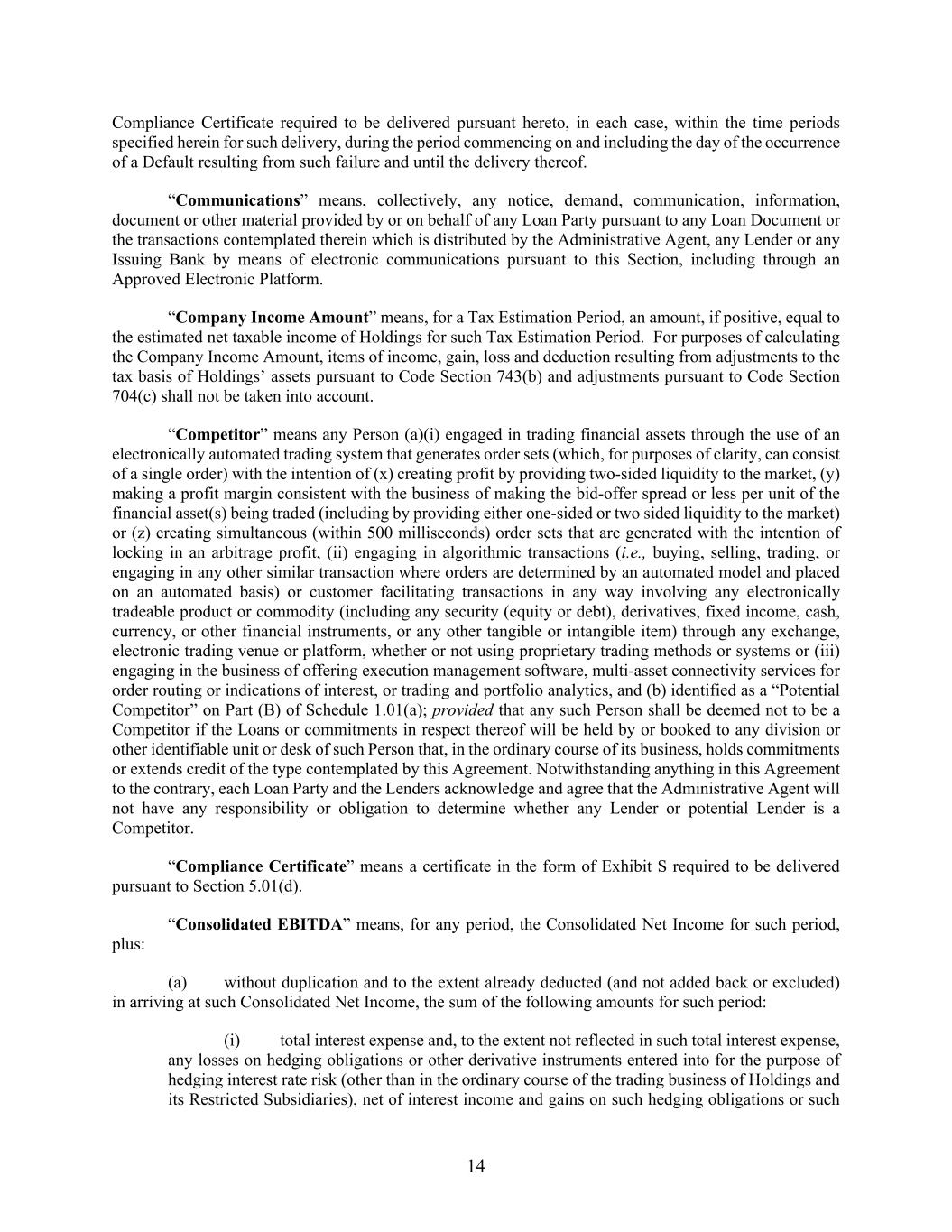 14 Compliance Certificate required to be delivered pursuant hereto, in each case, within the time periods specified herein for such delivery, during the period commencing on and including the day of the occurrence of a Default resulting from such failure and until the delivery thereof. “Communications” means, collectively, any notice, demand, communication, information, document or other material provided by or on behalf of any Loan Party pursuant to any Loan Document or the transactions contemplated therein which is distributed by the Administrative Agent, any Lender or any Issuing Bank by means of electronic communications pursuant to this Section, including through an Approved Electronic Platform. “Company Income Amount” means, for a Tax Estimation Period, an amount, if positive, equal to the estimated net taxable income of Holdings for such Tax Estimation Period. For purposes of calculating the Company Income Amount, items of income, gain, loss and deduction resulting from adjustments to the tax basis of Holdings’ assets pursuant to Code Section 743(b) and adjustments pursuant to Code Section 704(c) shall not be taken into account. “Competitor” means any Person (a)(i) engaged in trading financial assets through the use of an electronically automated trading system that generates order sets (which, for purposes of clarity, can consist of a single order) with the intention of (x) creating profit by providing two-sided liquidity to the market, (y) making a profit margin consistent with the business of making the bid-offer spread or less per unit of the financial asset(s) being traded (including by providing either one-sided or two sided liquidity to the market) or (z) creating simultaneous (within 500 milliseconds) order sets that are generated with the intention of locking in an arbitrage profit, (ii) engaging in algorithmic transactions (i.e., buying, selling, trading, or engaging in any other similar transaction where orders are determined by an automated model and placed on an automated basis) or customer facilitating transactions in any way involving any electronically tradeable product or commodity (including any security (equity or debt), derivatives, fixed income, cash, currency, or other financial instruments, or any other tangible or intangible item) through any exchange, electronic trading venue or platform, whether or not using proprietary trading methods or systems or (iii) engaging in the business of offering execution management software, multi-asset connectivity services for order routing or indications of interest, or trading and portfolio analytics, and (b) identified as a “Potential Competitor” on Part (B) of Schedule 1.01(a); provided that any such Person shall be deemed not to be a Competitor if the Loans or commitments in respect thereof will be held by or booked to any division or other identifiable unit or desk of such Person that, in the ordinary course of its business, holds commitments or extends credit of the type contemplated by this Agreement. Notwithstanding anything in this Agreement to the contrary, each Loan Party and the Lenders acknowledge and agree that the Administrative Agent will not have any responsibility or obligation to determine whether any Lender or potential Lender is a Competitor. “Compliance Certificate” means a certificate in the form of Exhibit S required to be delivered pursuant to Section 5.01(d). “Consolidated EBITDA” means, for any period, the Consolidated Net Income for such period, plus: (a) without duplication and to the extent already deducted (and not added back or excluded) in arriving at such Consolidated Net Income, the sum of the following amounts for such period: (i) total interest expense and, to the extent not reflected in such total interest expense, any losses on hedging obligations or other derivative instruments entered into for the purpose of hedging interest rate risk (other than in the ordinary course of the trading business of Holdings and its Restricted Subsidiaries), net of interest income and gains on such hedging obligations or such
