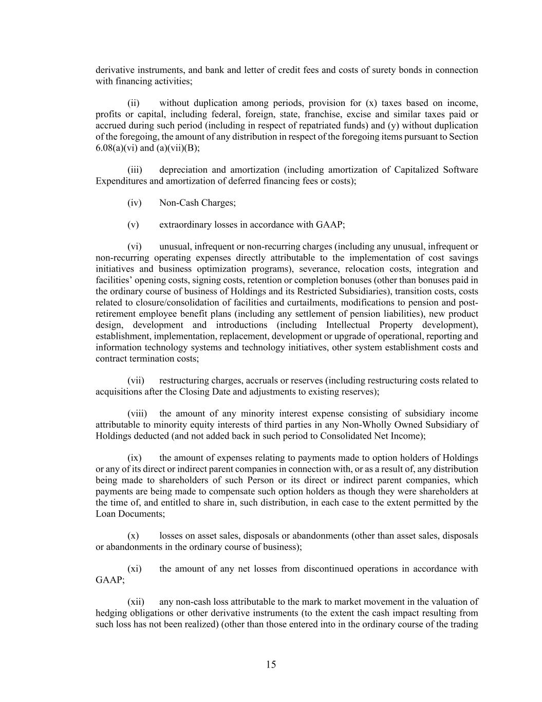 15 derivative instruments, and bank and letter of credit fees and costs of surety bonds in connection with financing activities; (ii) without duplication among periods, provision for (x) taxes based on income, profits or capital, including federal, foreign, state, franchise, excise and similar taxes paid or accrued during such period (including in respect of repatriated funds) and (y) without duplication of the foregoing, the amount of any distribution in respect of the foregoing items pursuant to Section 6.08(a)(vi) and (a)(vii)(B); (iii) depreciation and amortization (including amortization of Capitalized Software Expenditures and amortization of deferred financing fees or costs); (iv) Non-Cash Charges; (v) extraordinary losses in accordance with GAAP; (vi) unusual, infrequent or non-recurring charges (including any unusual, infrequent or non-recurring operating expenses directly attributable to the implementation of cost savings initiatives and business optimization programs), severance, relocation costs, integration and facilities’ opening costs, signing costs, retention or completion bonuses (other than bonuses paid in the ordinary course of business of Holdings and its Restricted Subsidiaries), transition costs, costs related to closure/consolidation of facilities and curtailments, modifications to pension and post- retirement employee benefit plans (including any settlement of pension liabilities), new product design, development and introductions (including Intellectual Property development), establishment, implementation, replacement, development or upgrade of operational, reporting and information technology systems and technology initiatives, other system establishment costs and contract termination costs; (vii) restructuring charges, accruals or reserves (including restructuring costs related to acquisitions after the Closing Date and adjustments to existing reserves); (viii) the amount of any minority interest expense consisting of subsidiary income attributable to minority equity interests of third parties in any Non-Wholly Owned Subsidiary of Holdings deducted (and not added back in such period to Consolidated Net Income); (ix) the amount of expenses relating to payments made to option holders of Holdings or any of its direct or indirect parent companies in connection with, or as a result of, any distribution being made to shareholders of such Person or its direct or indirect parent companies, which payments are being made to compensate such option holders as though they were shareholders at the time of, and entitled to share in, such distribution, in each case to the extent permitted by the Loan Documents; (x) losses on asset sales, disposals or abandonments (other than asset sales, disposals or abandonments in the ordinary course of business); (xi) the amount of any net losses from discontinued operations in accordance with GAAP; (xii) any non-cash loss attributable to the mark to market movement in the valuation of hedging obligations or other derivative instruments (to the extent the cash impact resulting from such loss has not been realized) (other than those entered into in the ordinary course of the trading